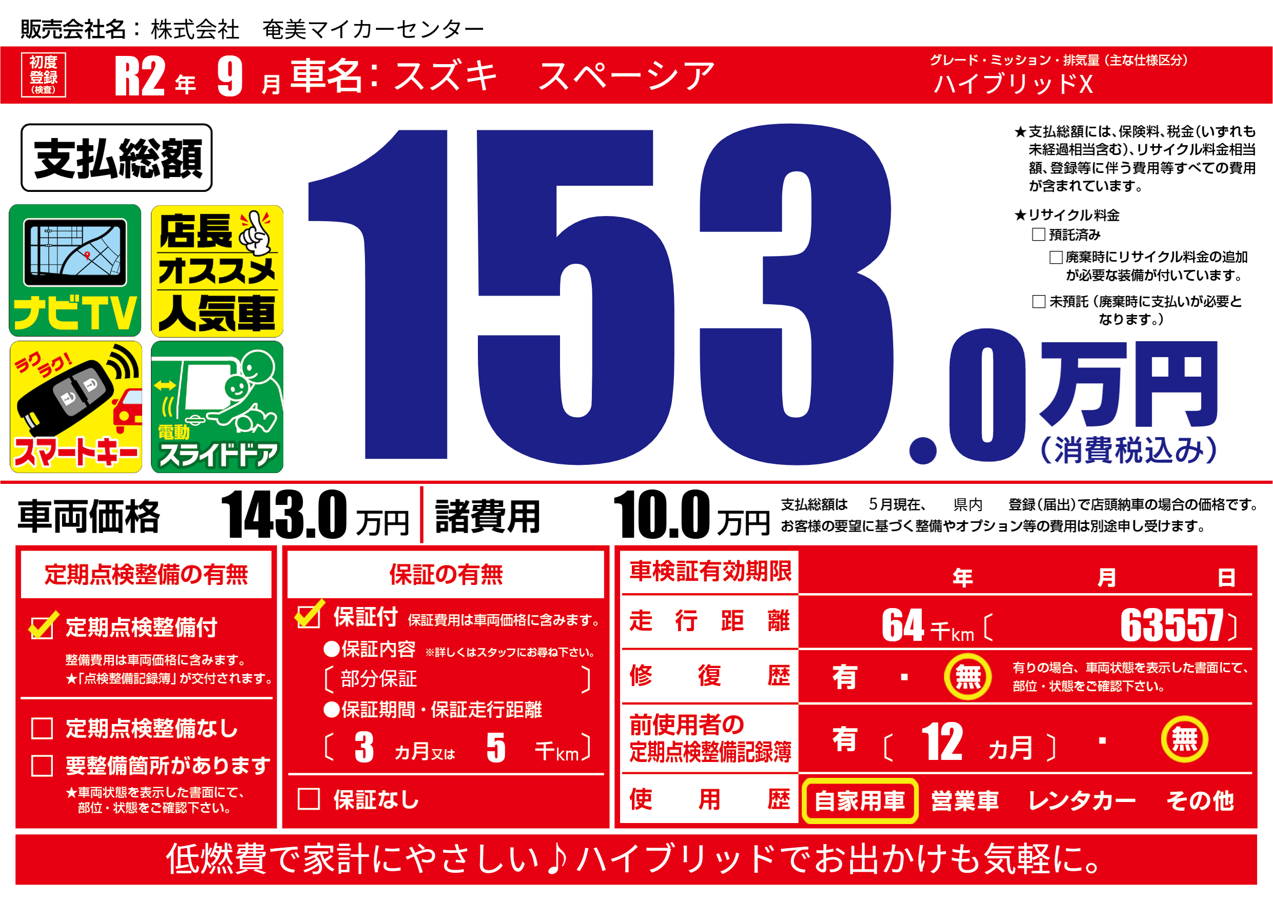 | 車名 | スズキ スペーシア | グレード ミッション 排気量 |