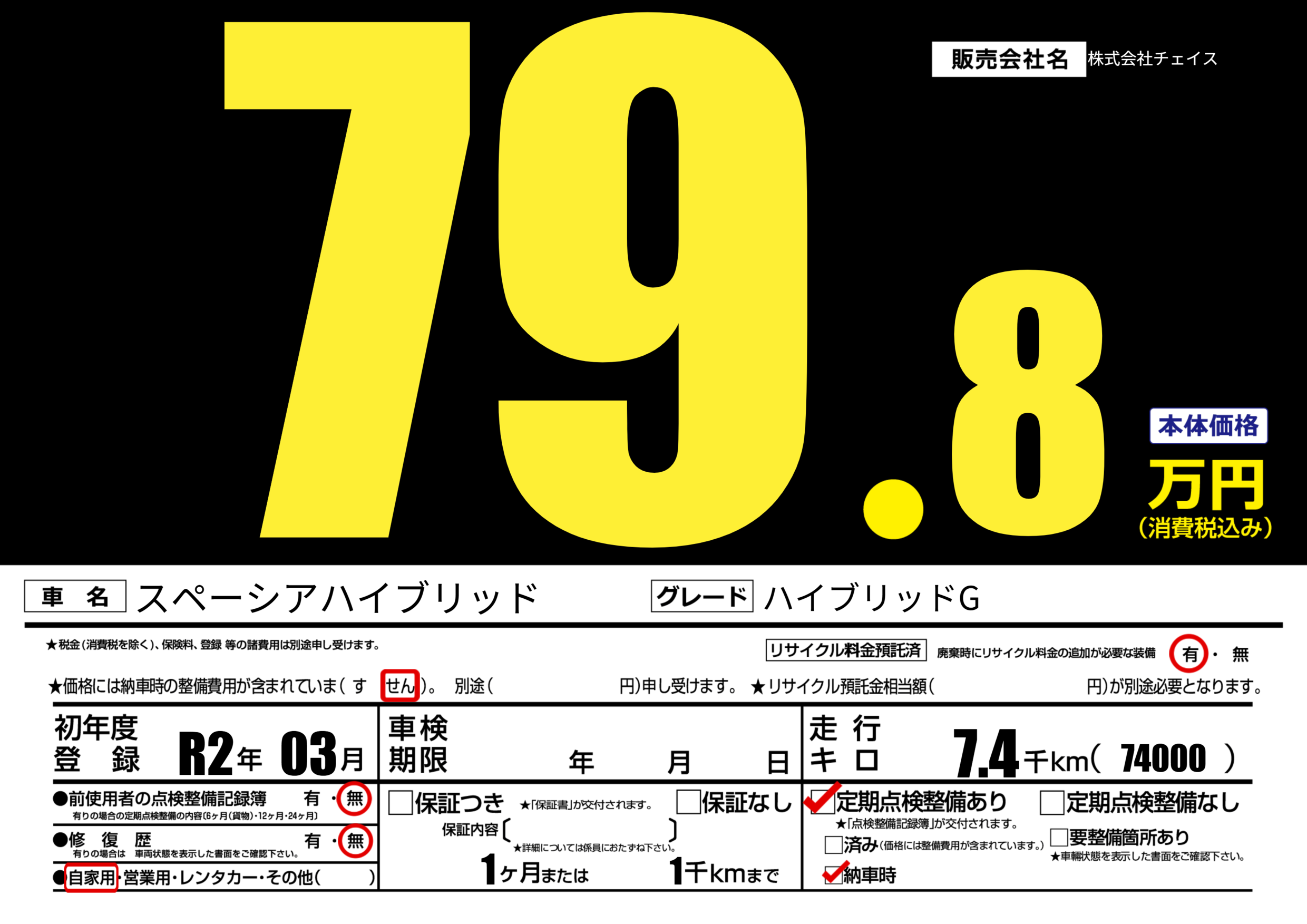 | 定期点検整備 | 定期点検整備あり 納車時あり | ||