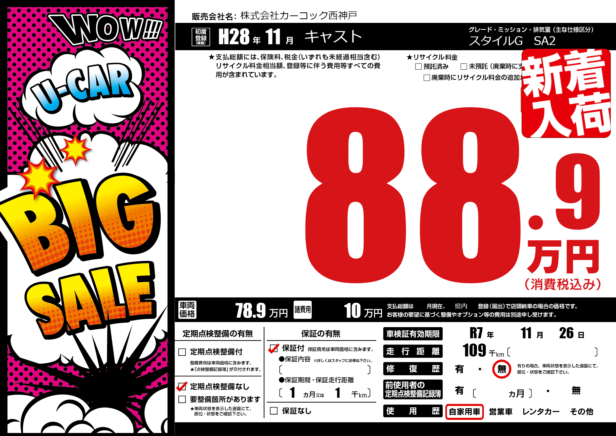 | 走行キロ | 10.9万km | 初年度登録 | H28年11月 |