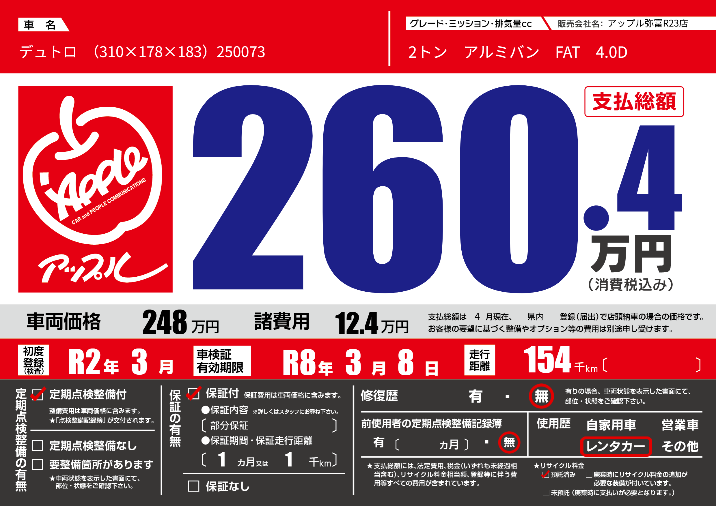 | 車名 | デュトロ (310×178×183)250073 | グレード ミッション 排気量 |
