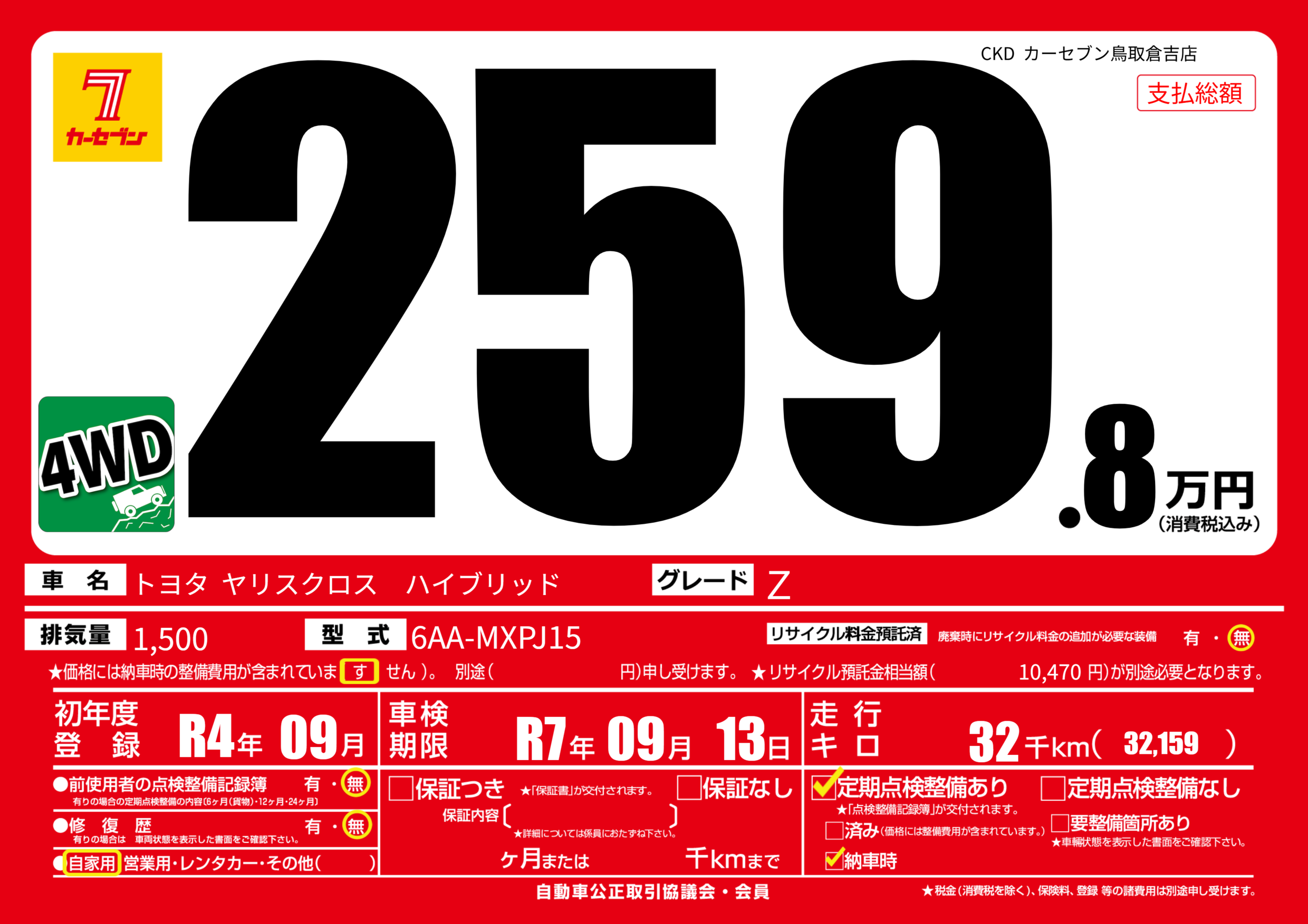 | 車名 | トヨタ ヤリスクロス ハイブリッド | グレード ミッション 排気量 |