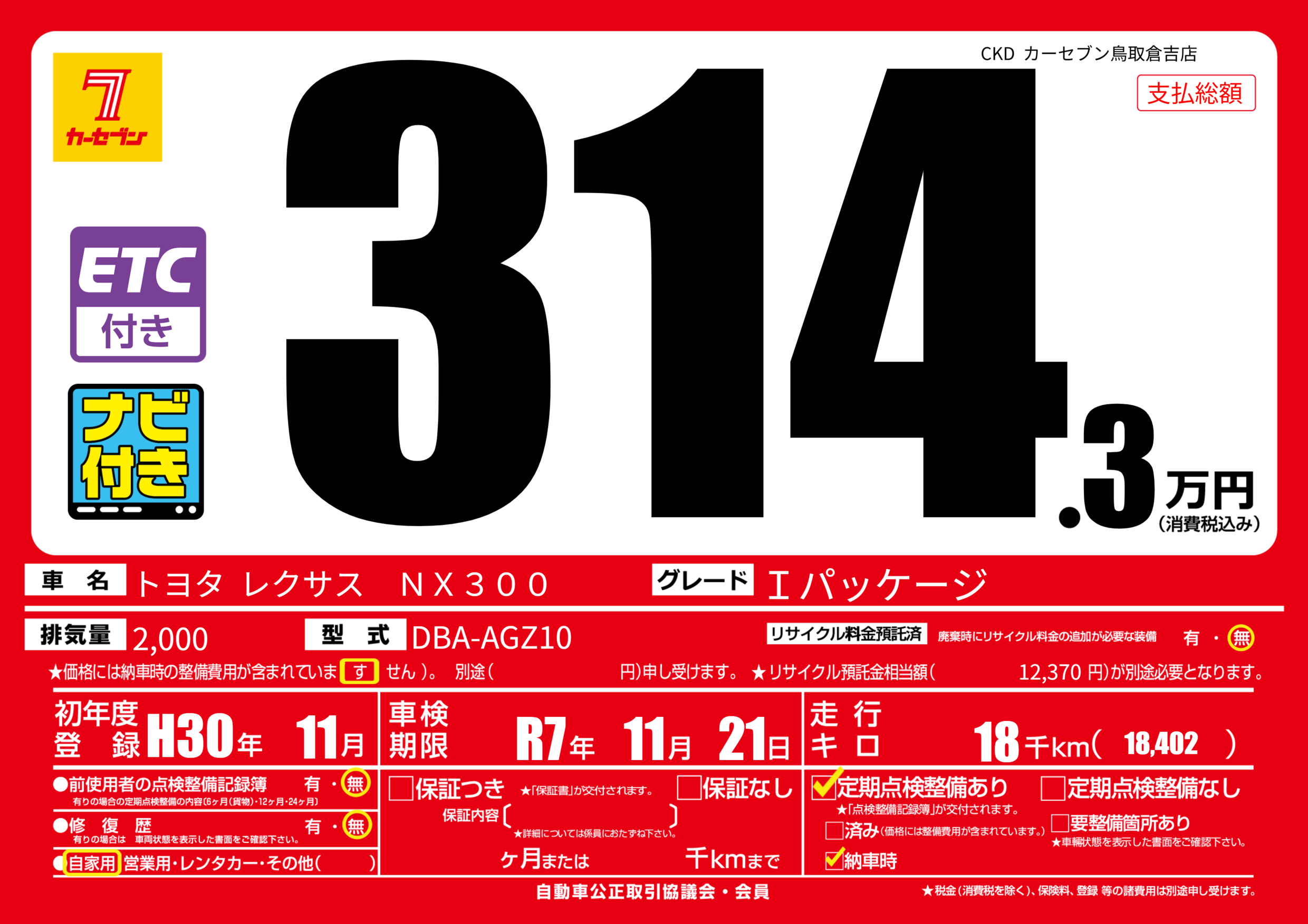 | 車名 | トヨタ レクサス NX300 | グレード ミッション 排気量 |