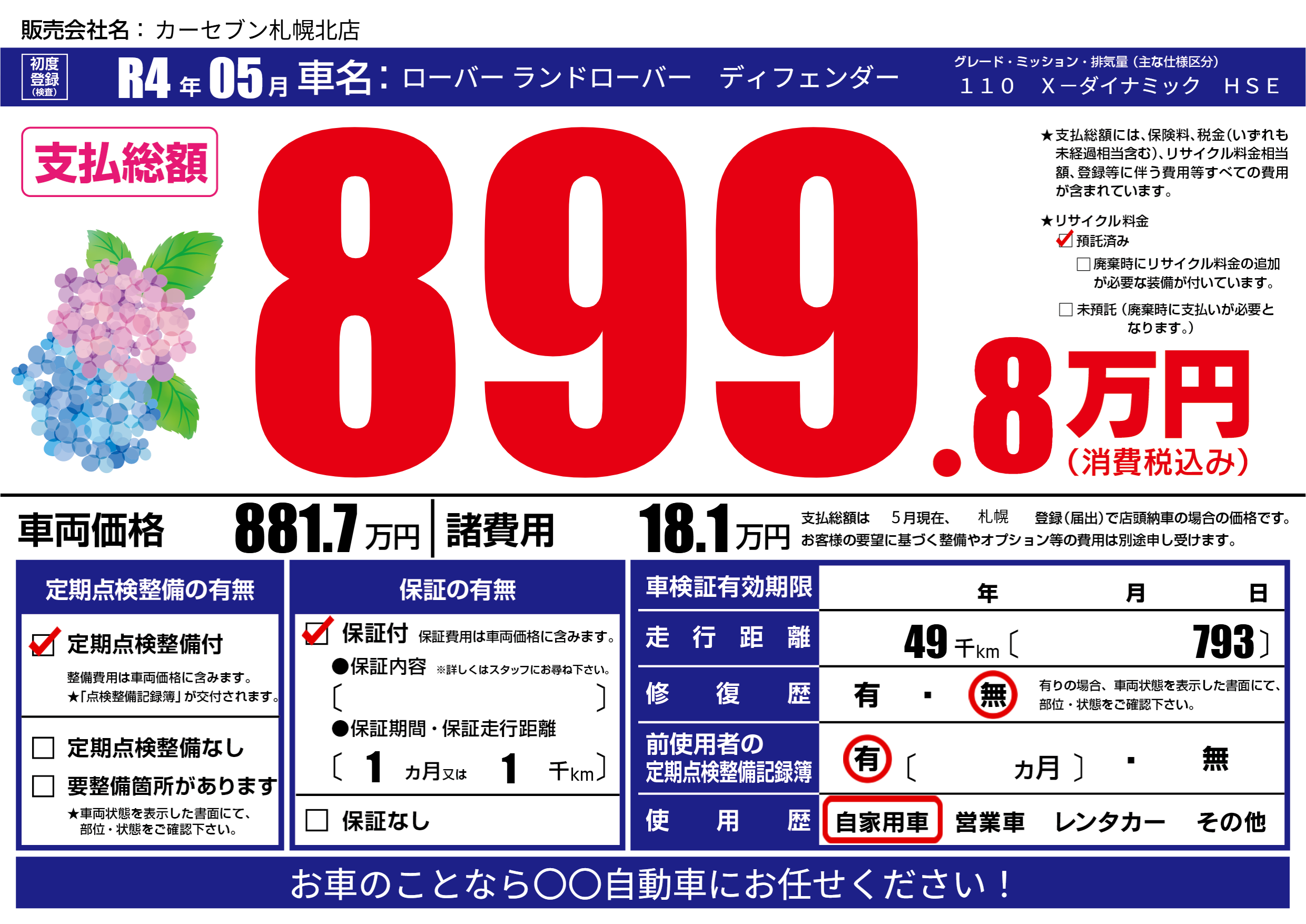 | 走行キロ | 4.9万km | 初年度登録 | R4年05月 |