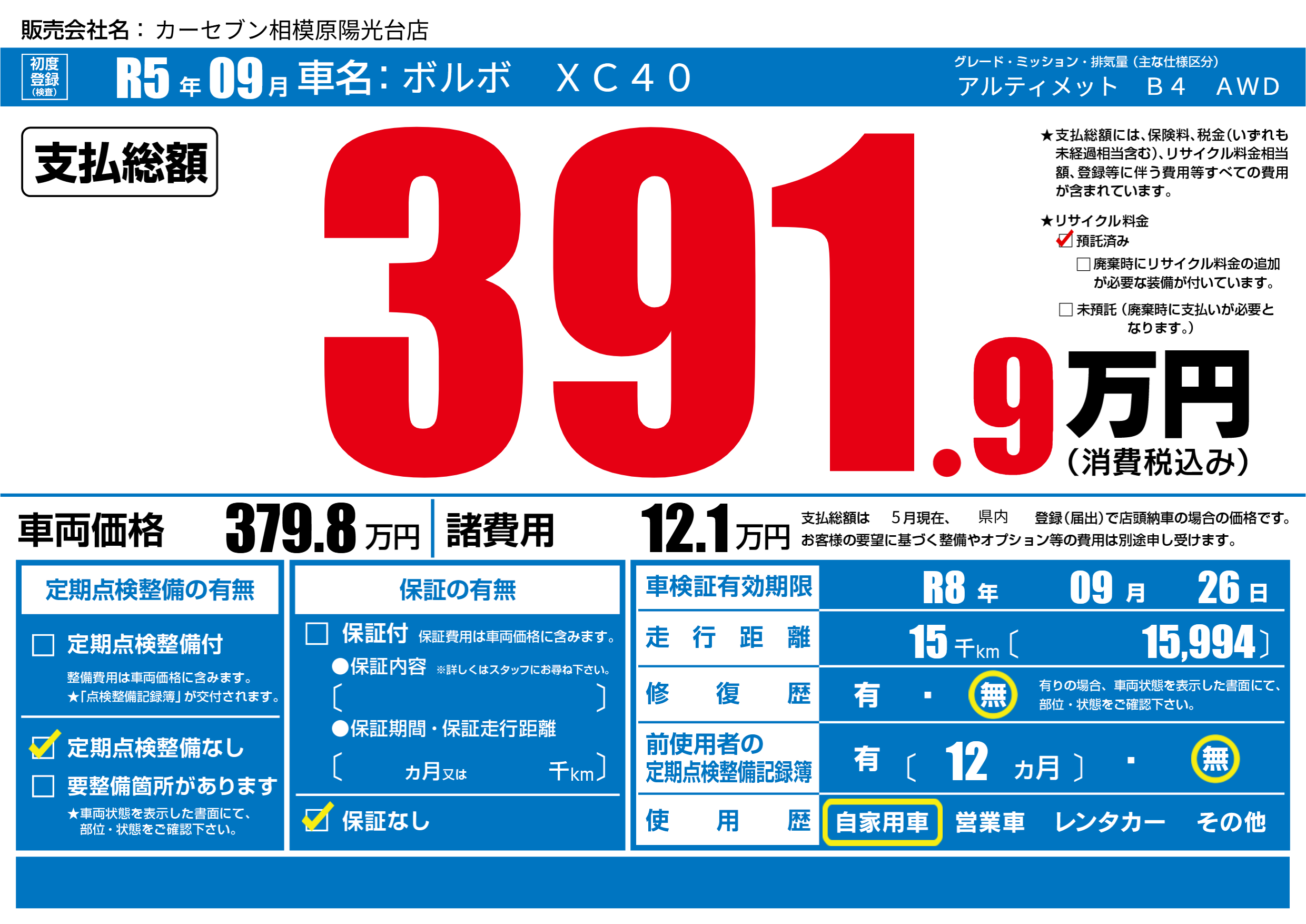 | 車名 | ボルボ XC40 | グレード ミッション 排気量 |