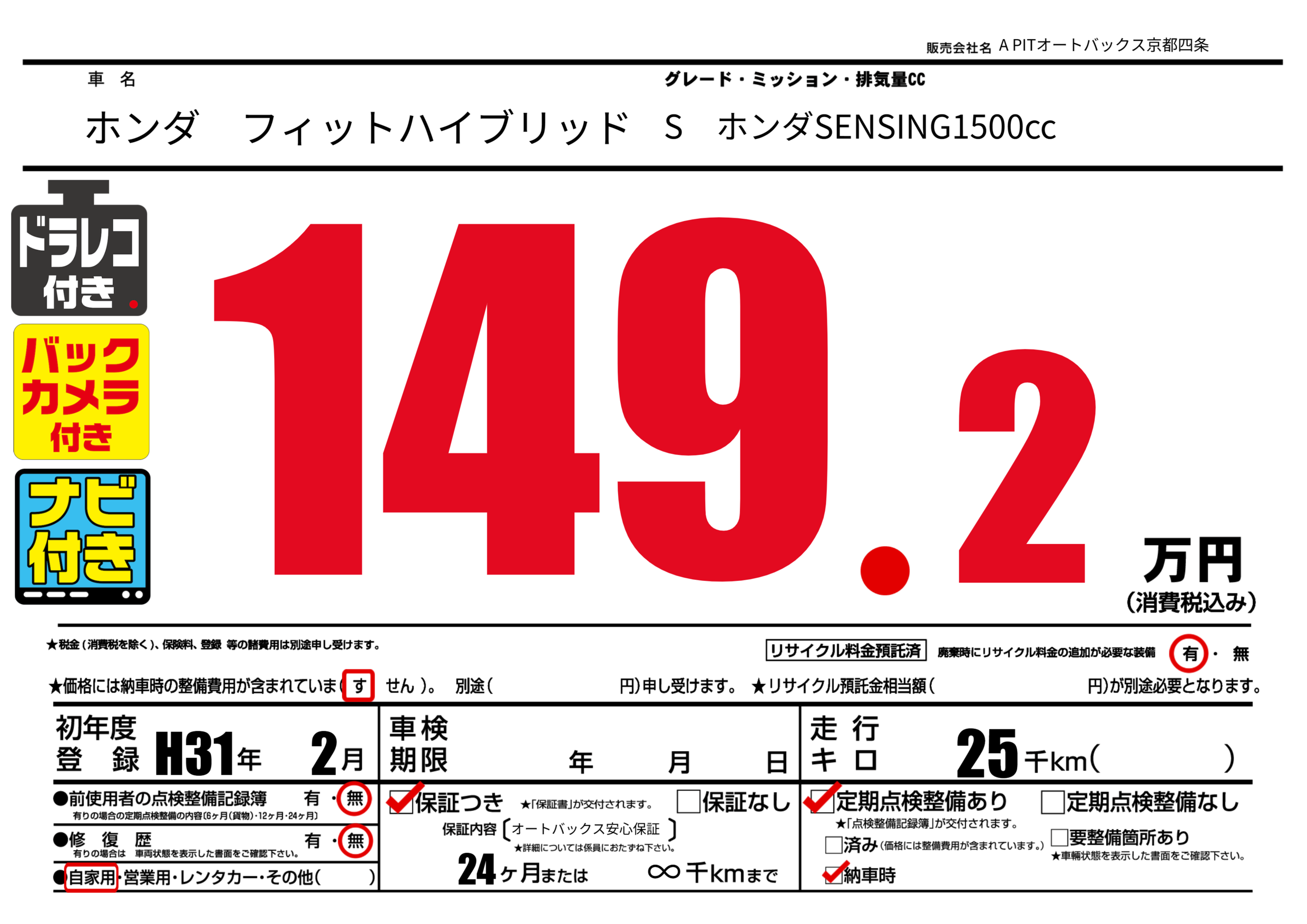 | 車名 | ホンダ フィットハイブリッド | グレード ミッション 排気量 |