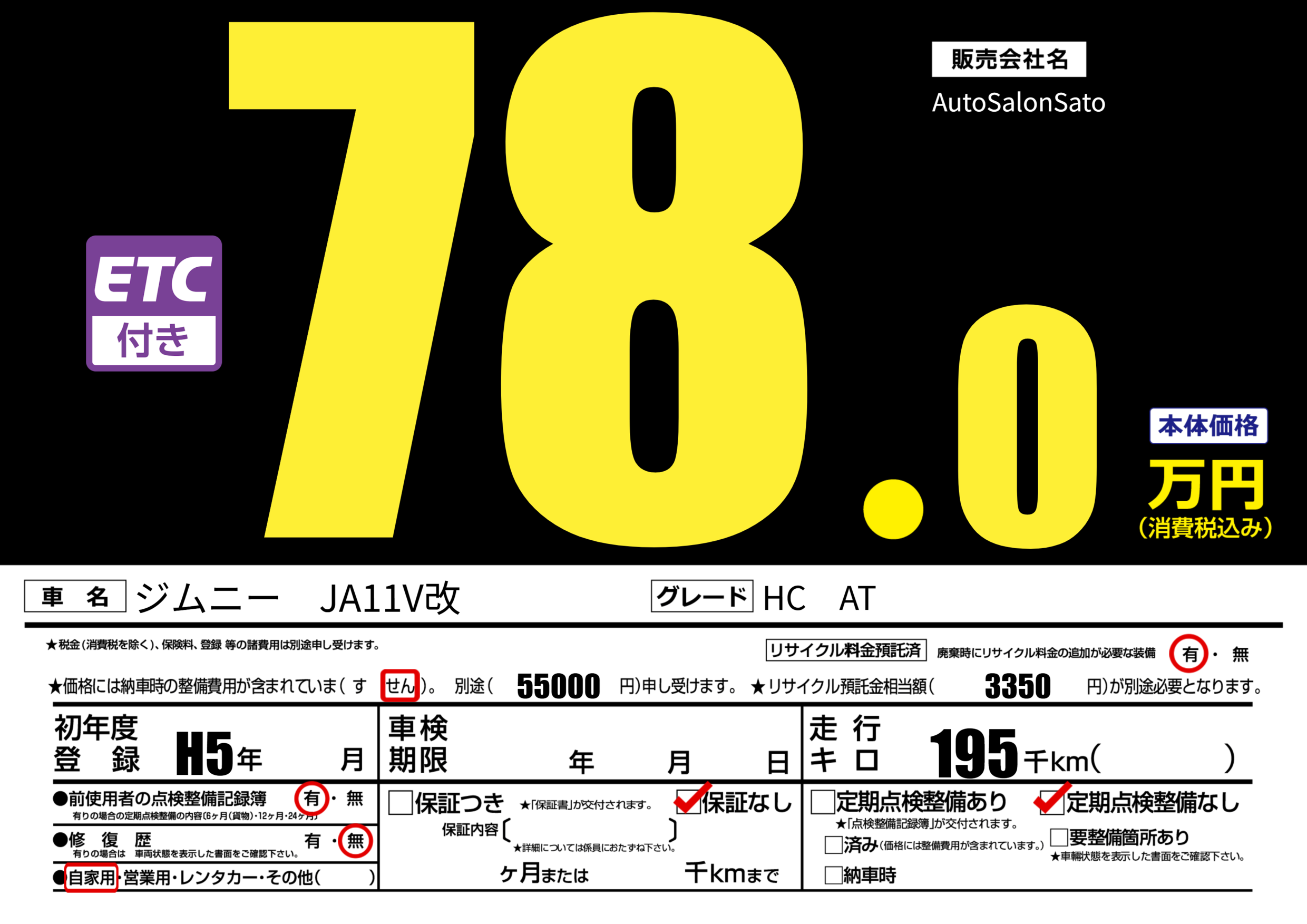 | 走行キロ | 19.5万km | 初年度登録 | H5年---月 |