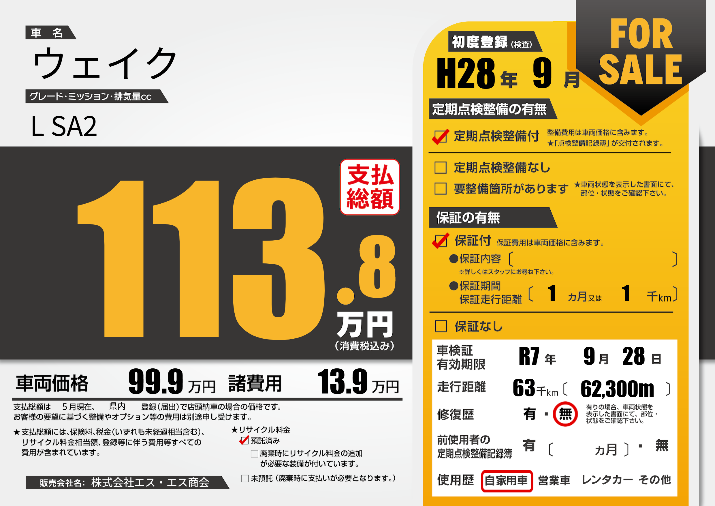 | 走行キロ | 6.3万km | 初年度登録 | H28年9月 |