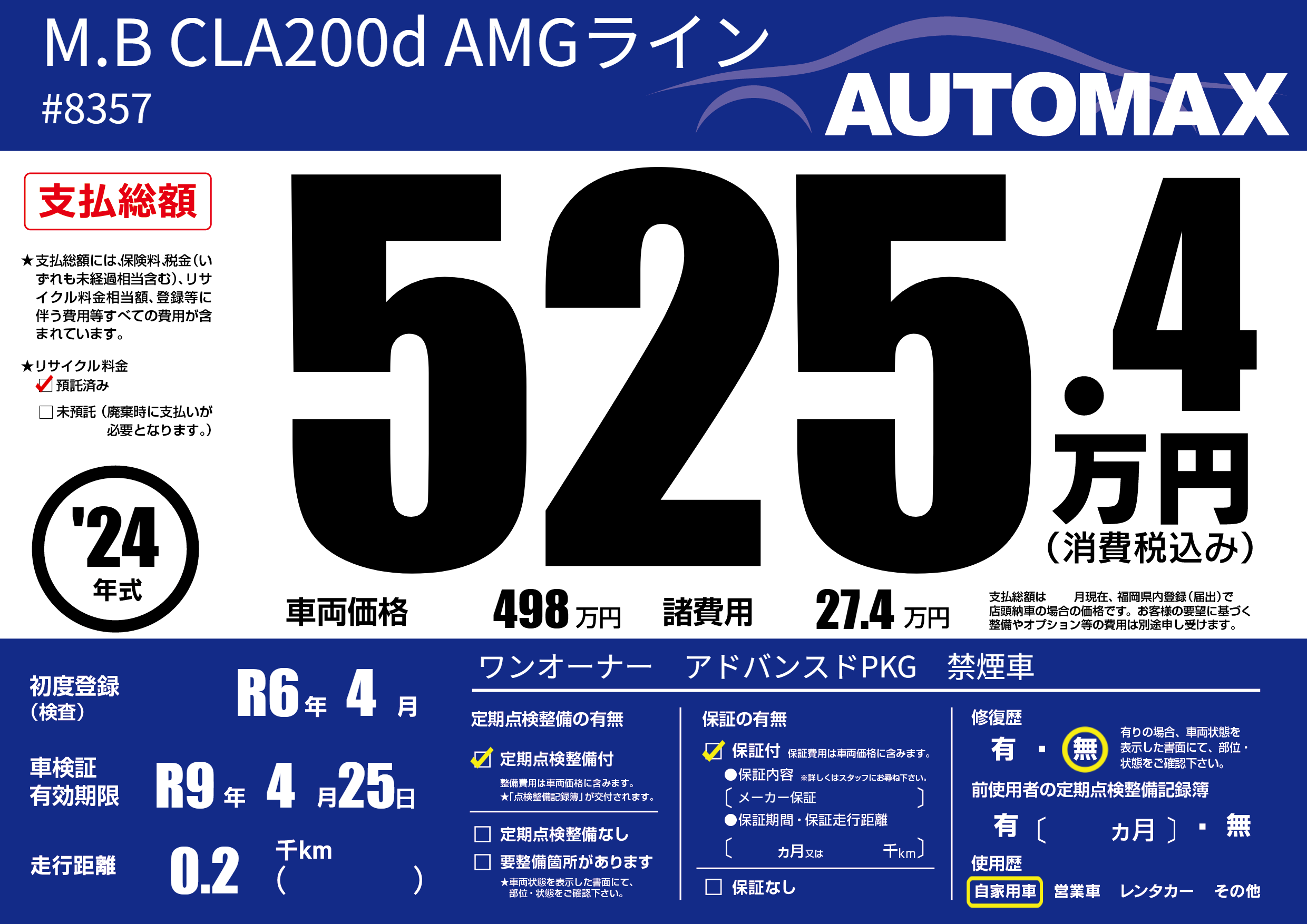 | 車名 | M.B CLA200d AMGライン | グレード ミッション 排気量 |