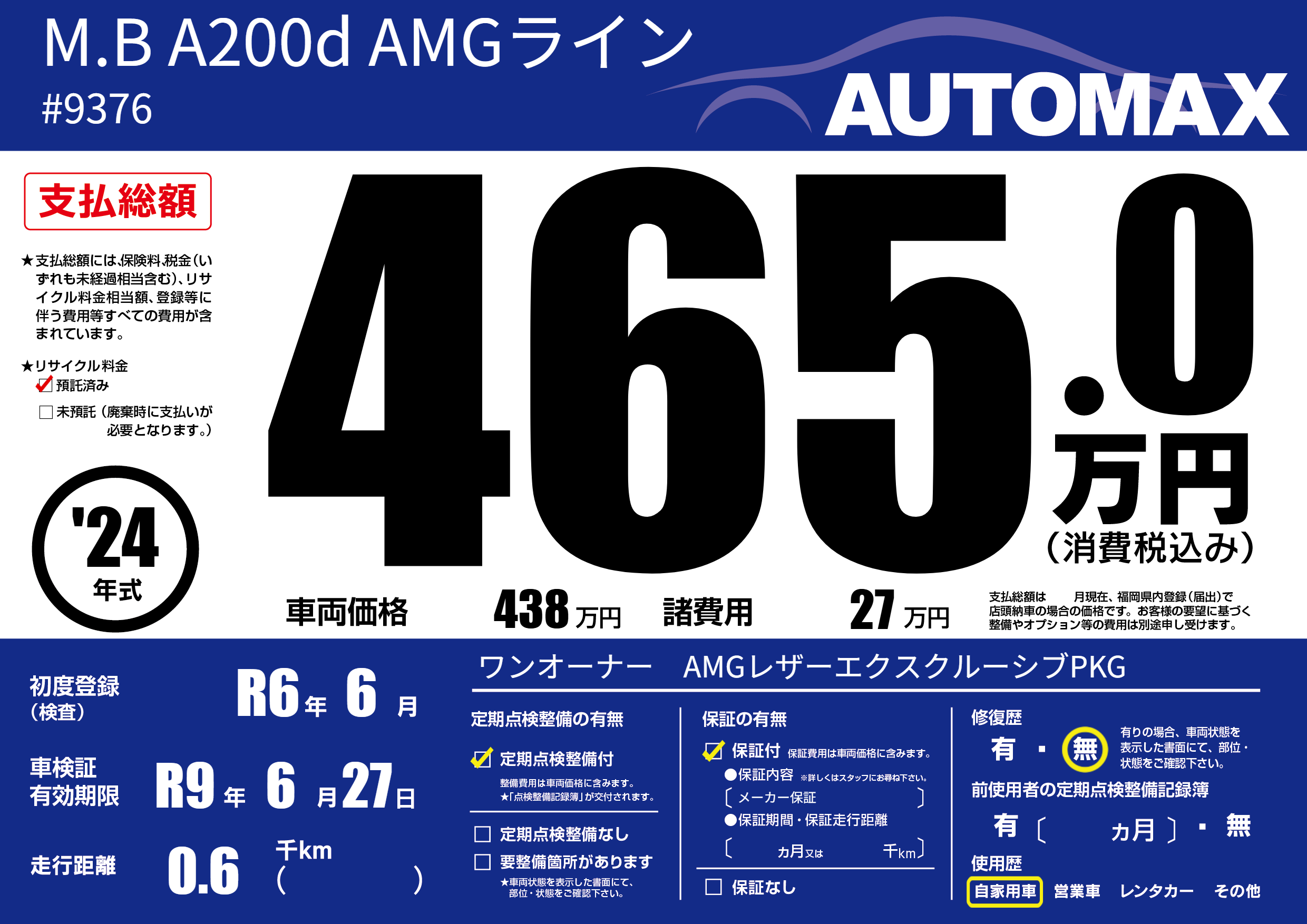 | 車名 | M.B A200d AMGライン | グレード ミッション 排気量 |