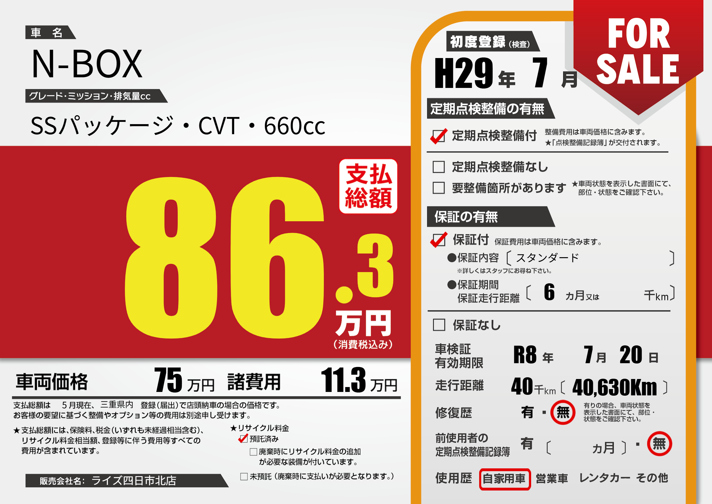 | 車名 | N-BOX | グレード ミッション 排気量 |