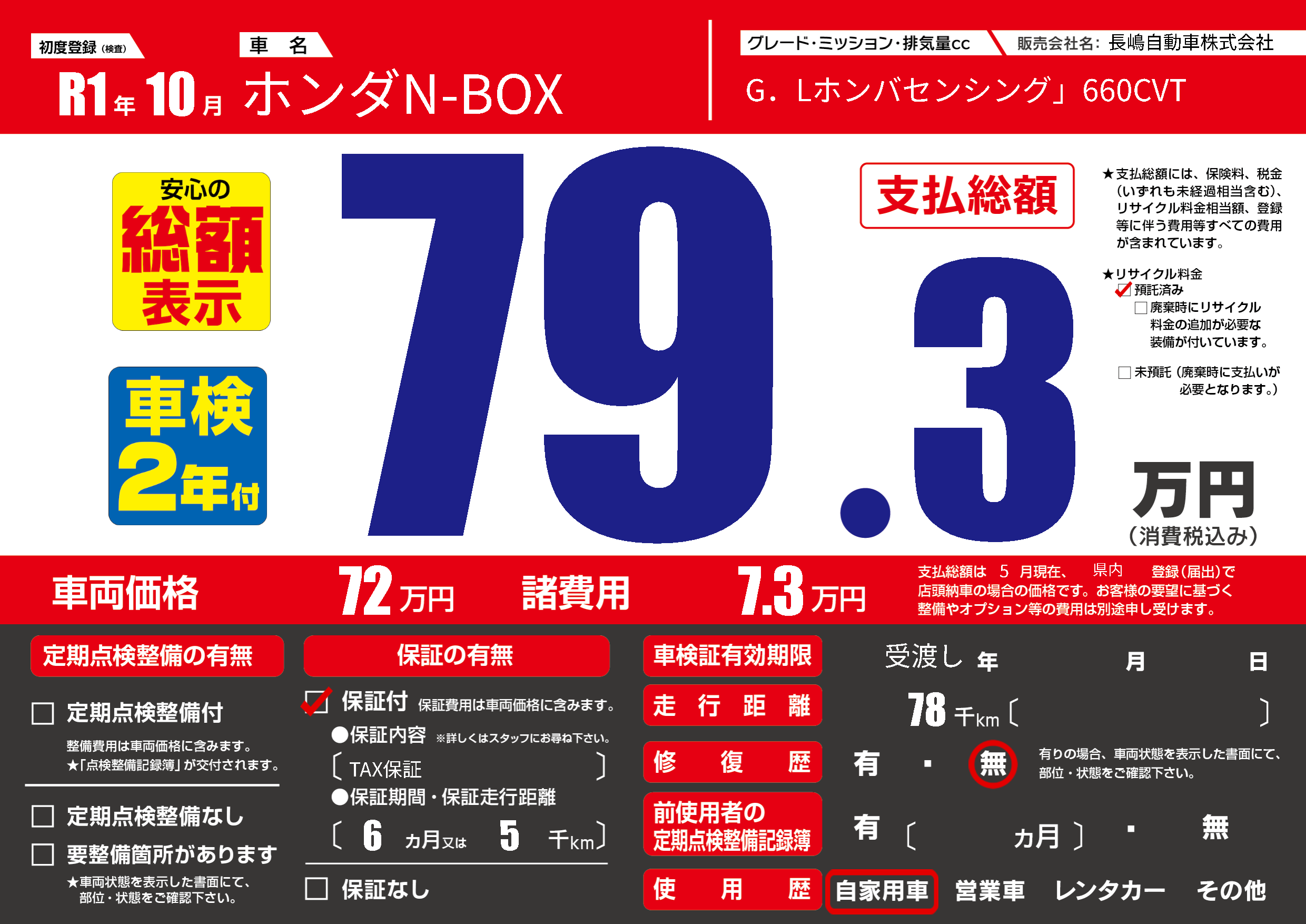 保証付き 保証内容(TAX保証) 6ヶ月または(5)千kmまで |