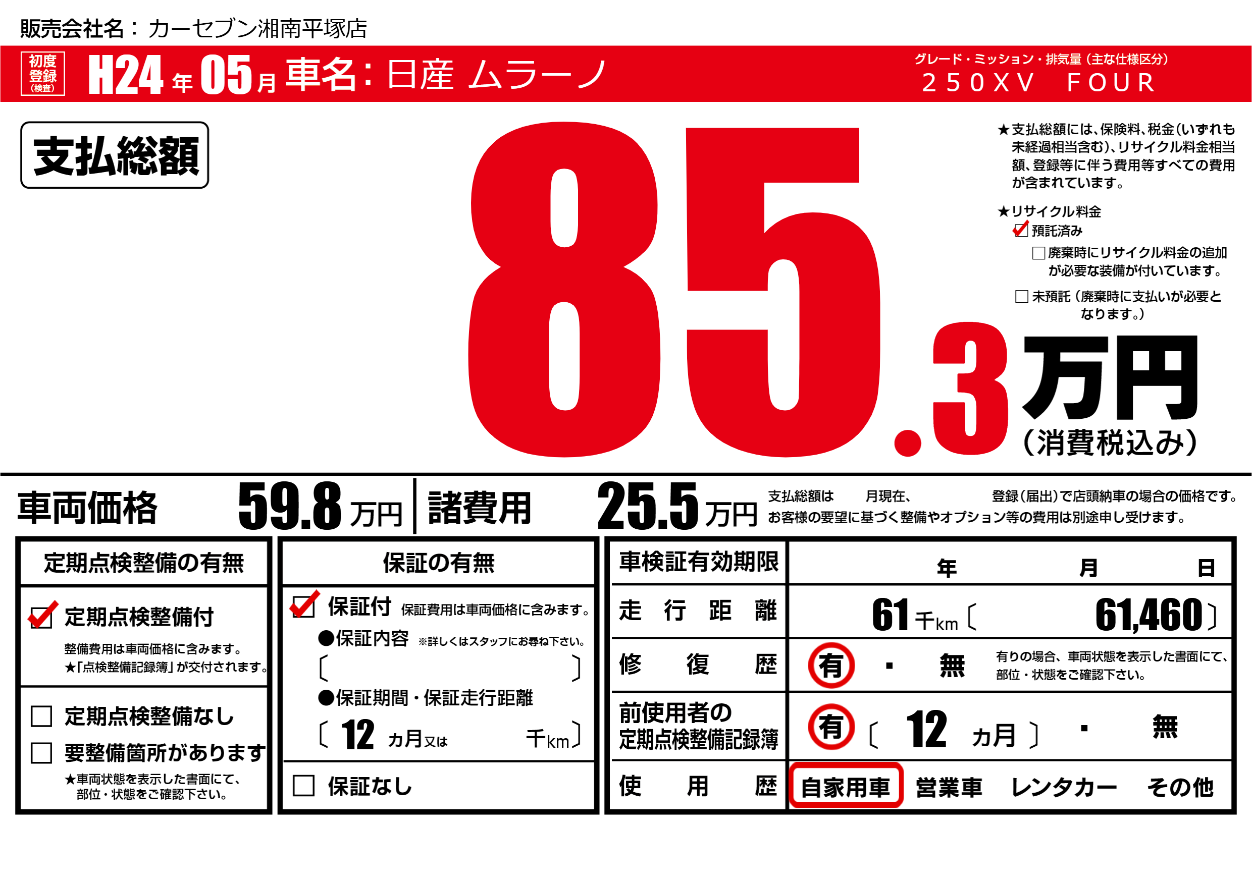 | 車名 | 日産 ムラーノ | グレード ミッション 排気量 |
