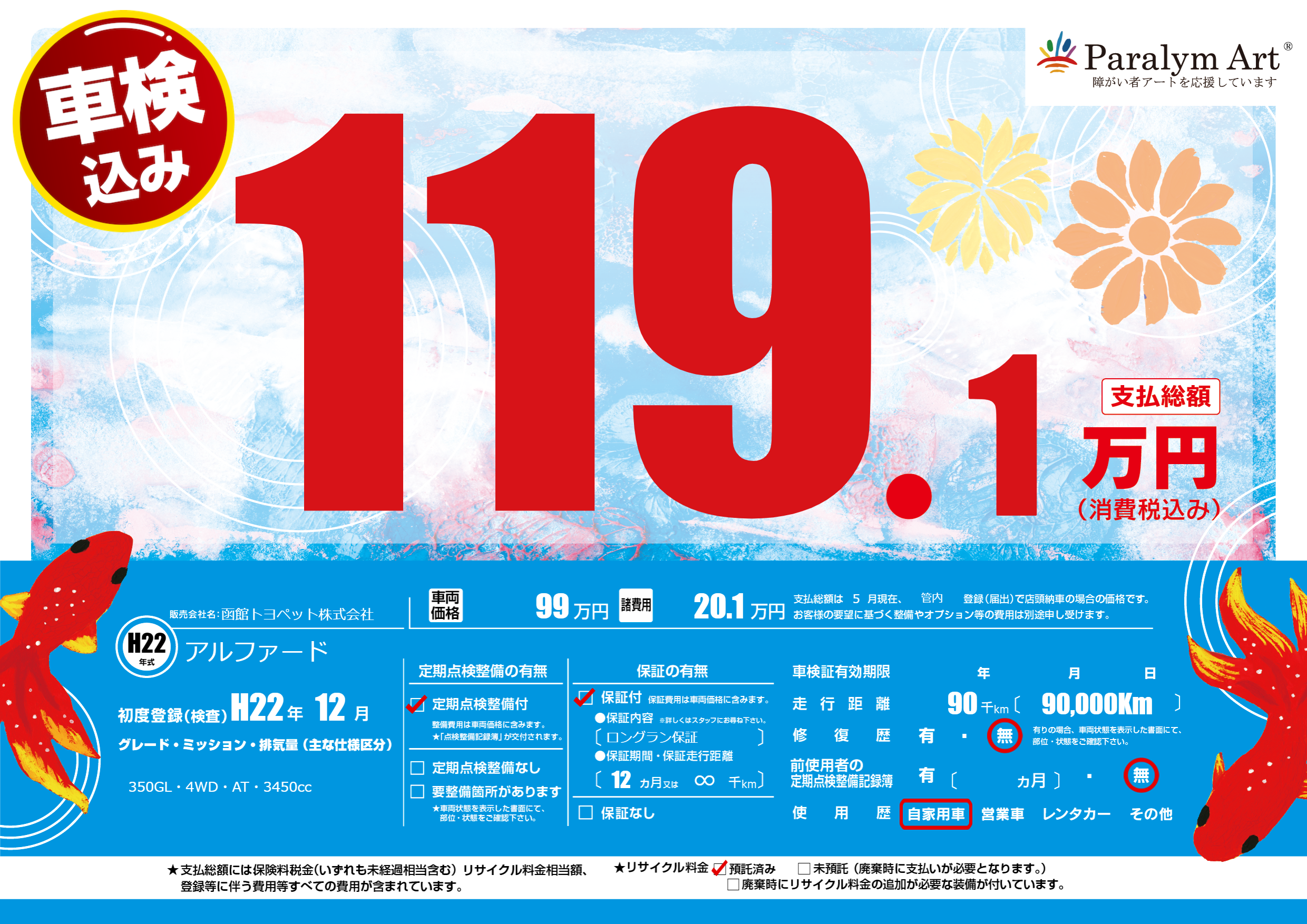 | 走行キロ | 9万km | 初年度登録 | H22年12月 |