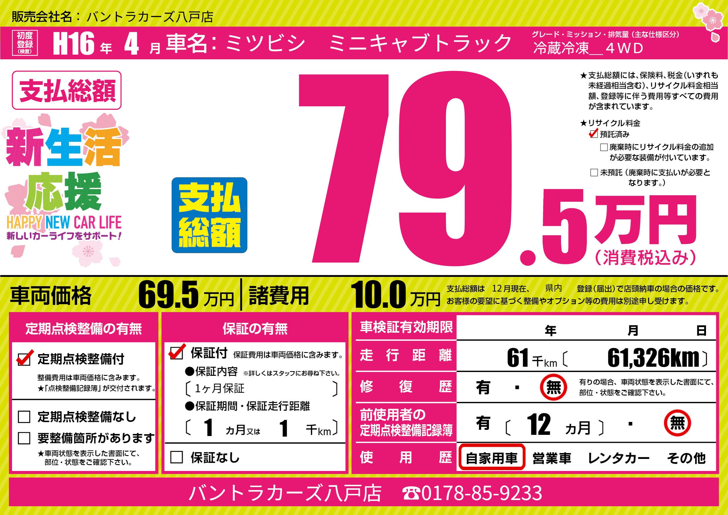 | 走行キロ | 6.1万km | 初年度登録 | H16年4月 |