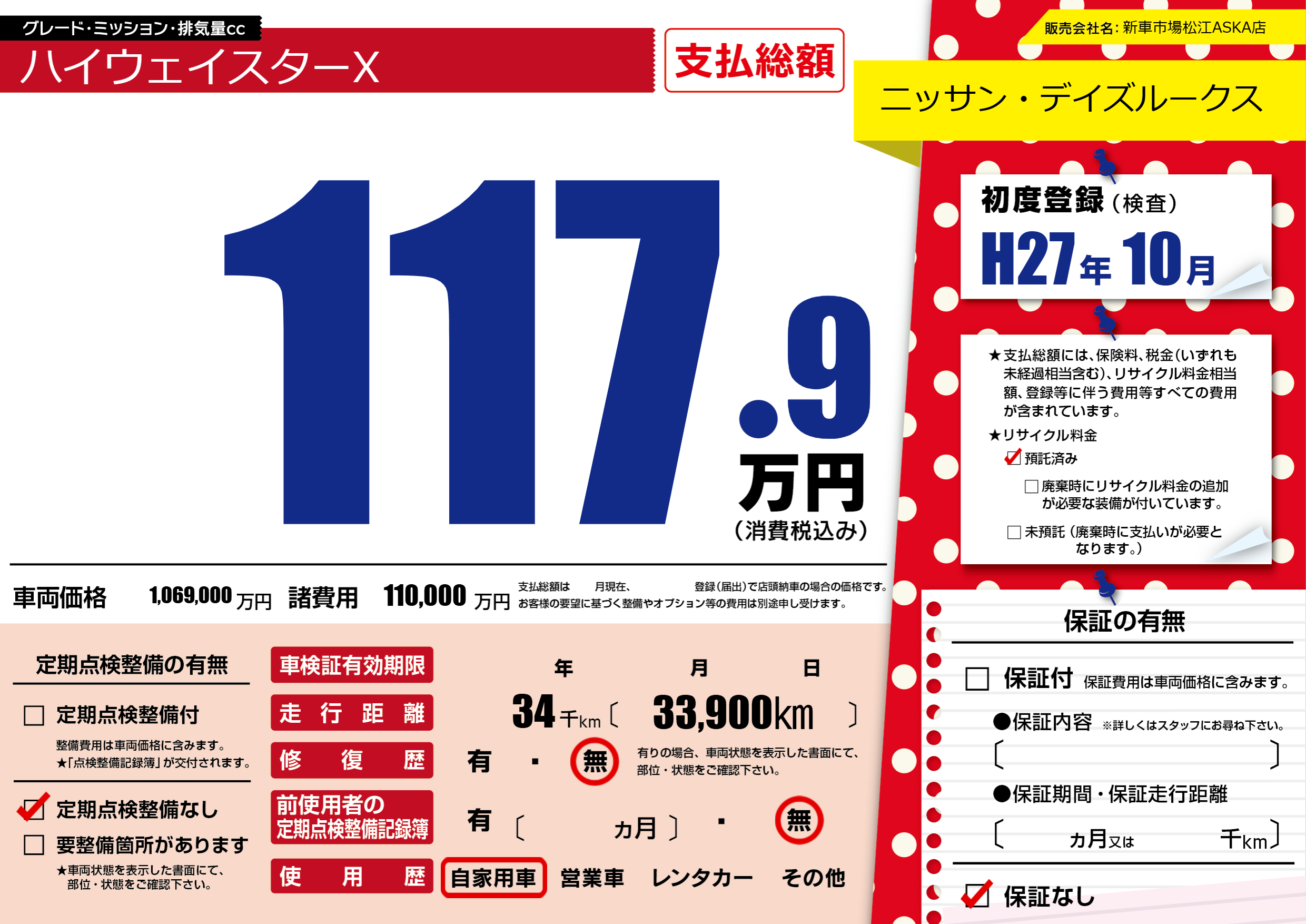 | 走行キロ | 3.4万km | 初年度登録 | H27年10月 |