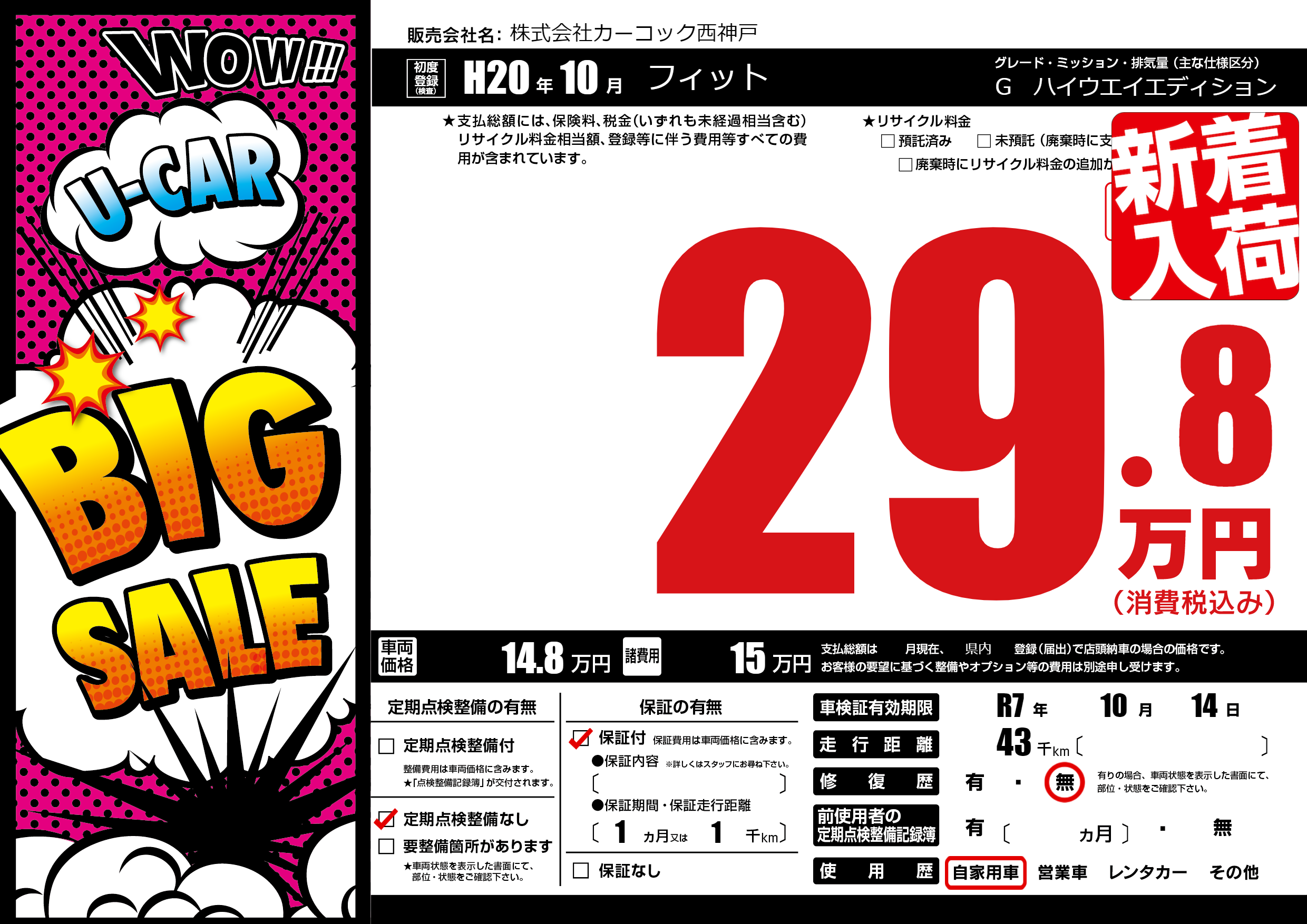 | 走行キロ | 4.3万km | 初年度登録 | H20年10月 |