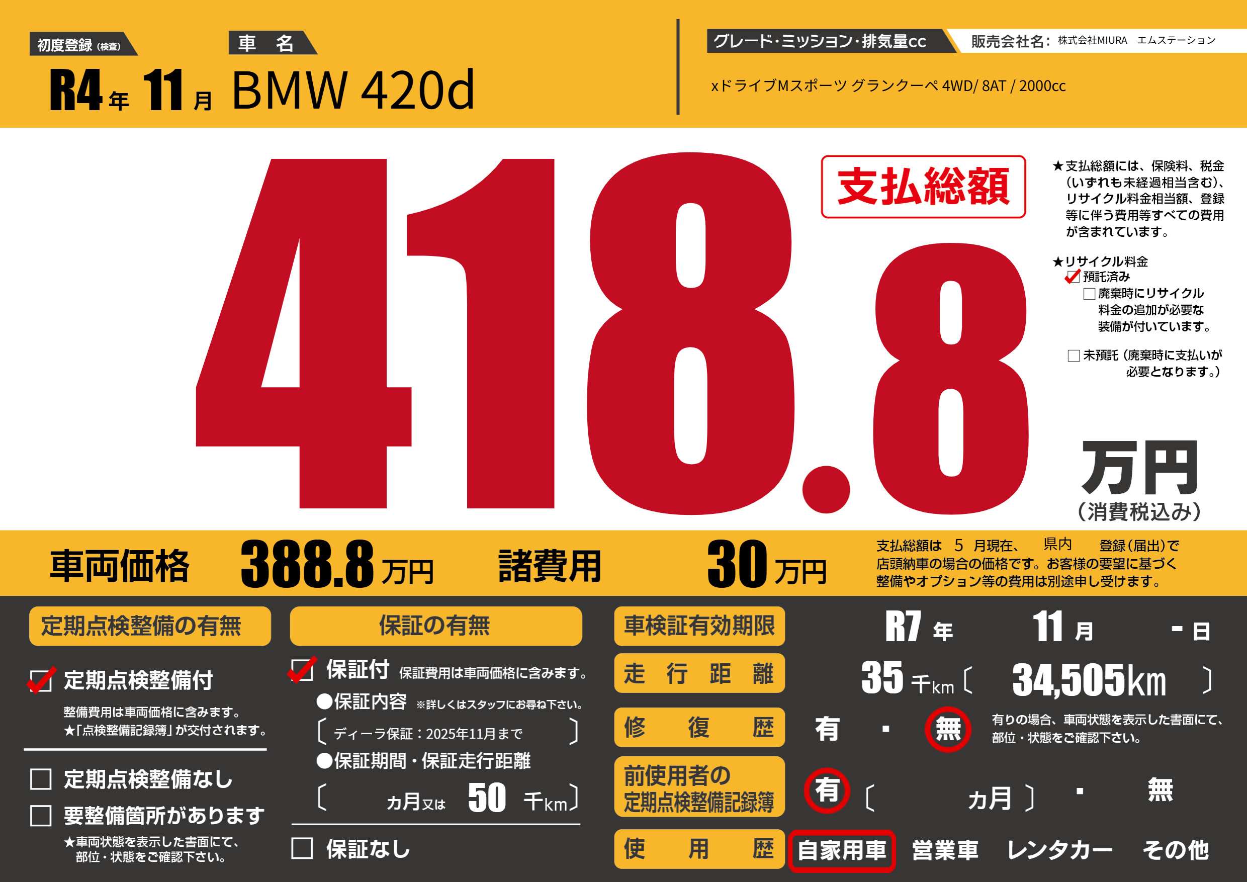| 車名 | BMW 420d | グレード ミッション 排気量 |