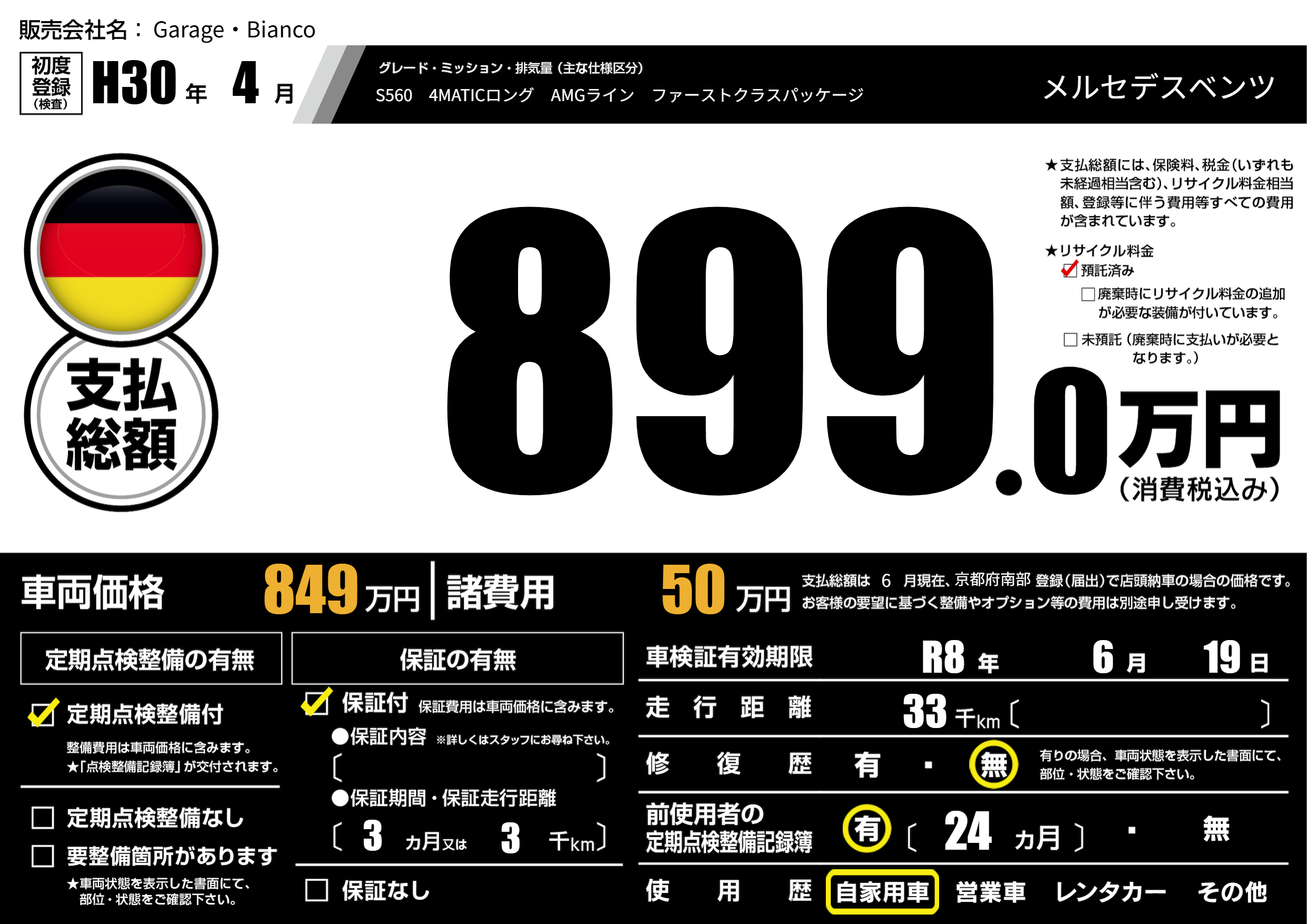 | 車名 | メルセデスベンツ | グレード ミッション 排気量 |