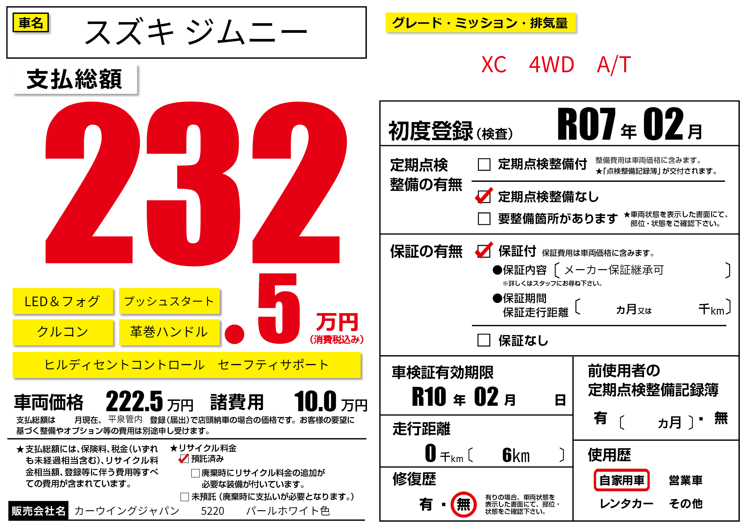 | 車名 | スズキ ジムニー | グレード ミッション 排気量 |