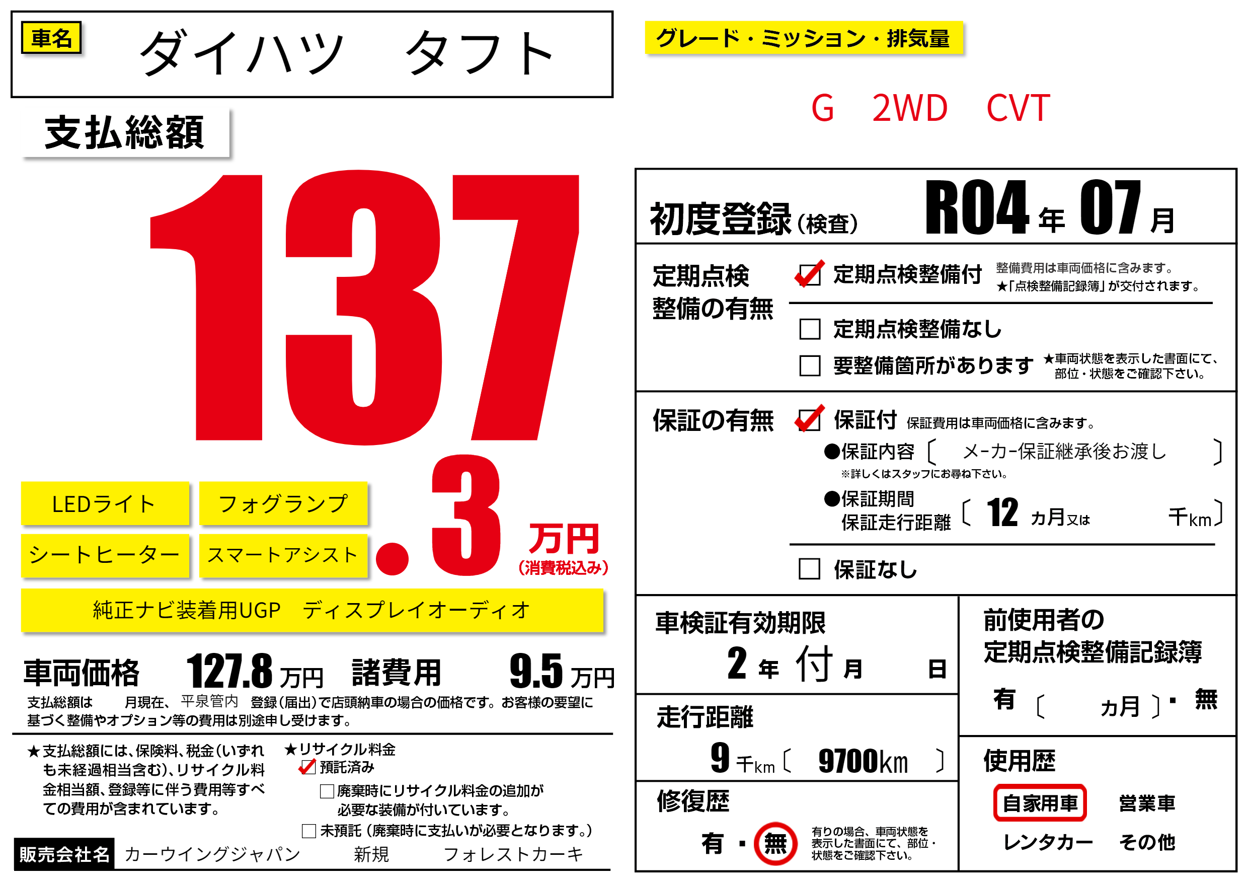 | 車名 | ダイハツ タフト | グレード ミッション 排気量 |