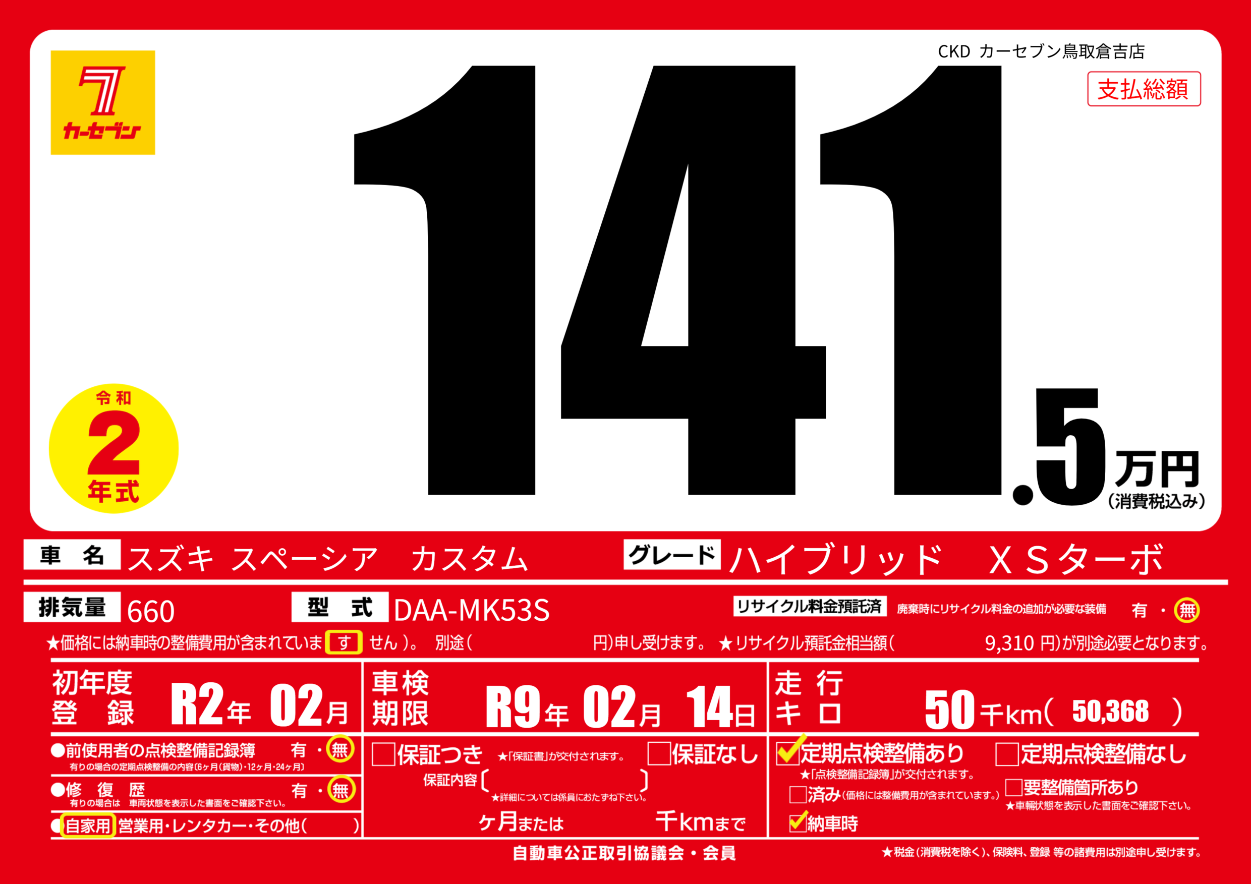 | 走行キロ | 5万km | 初年度登録 | R2年02月 |