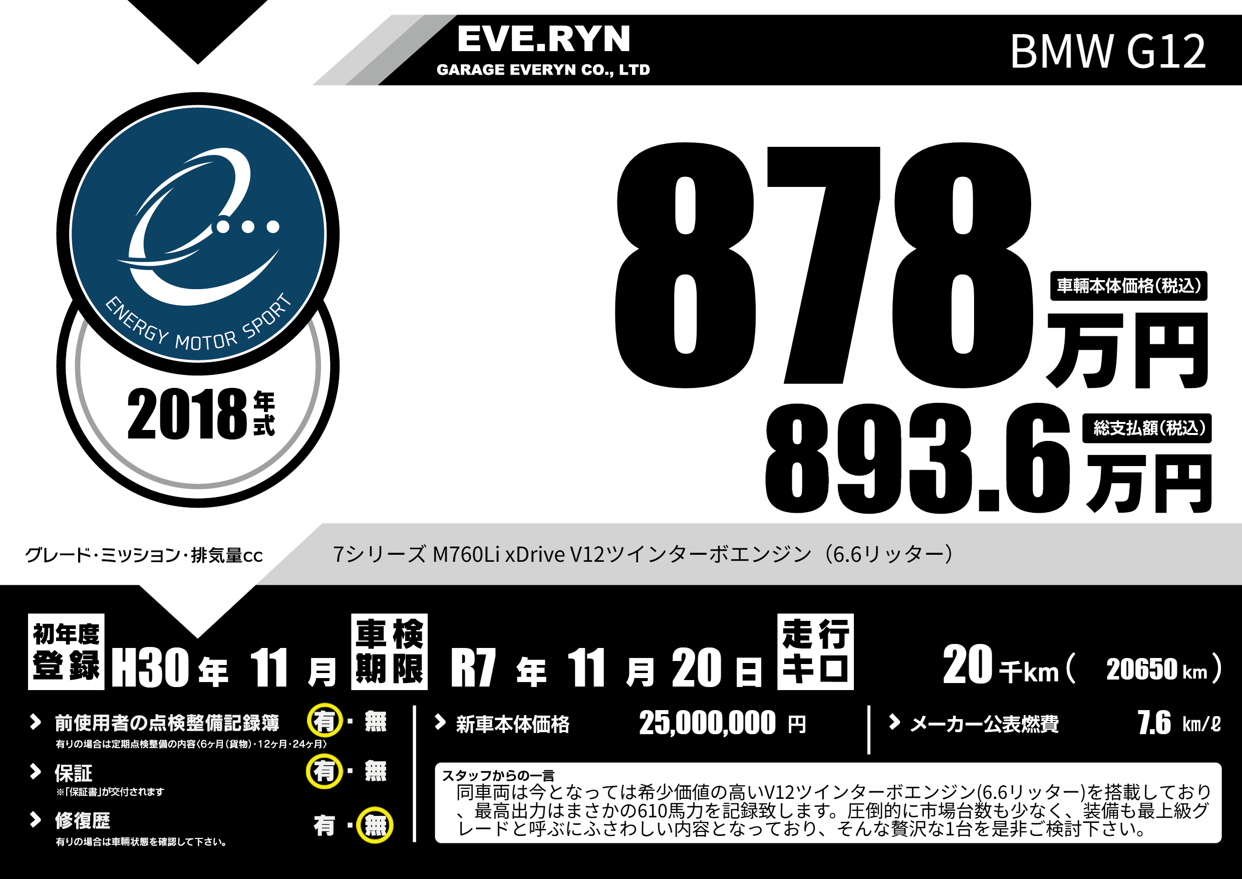 | 車名 | BMW G12 | グレード ミッション 排気量 |