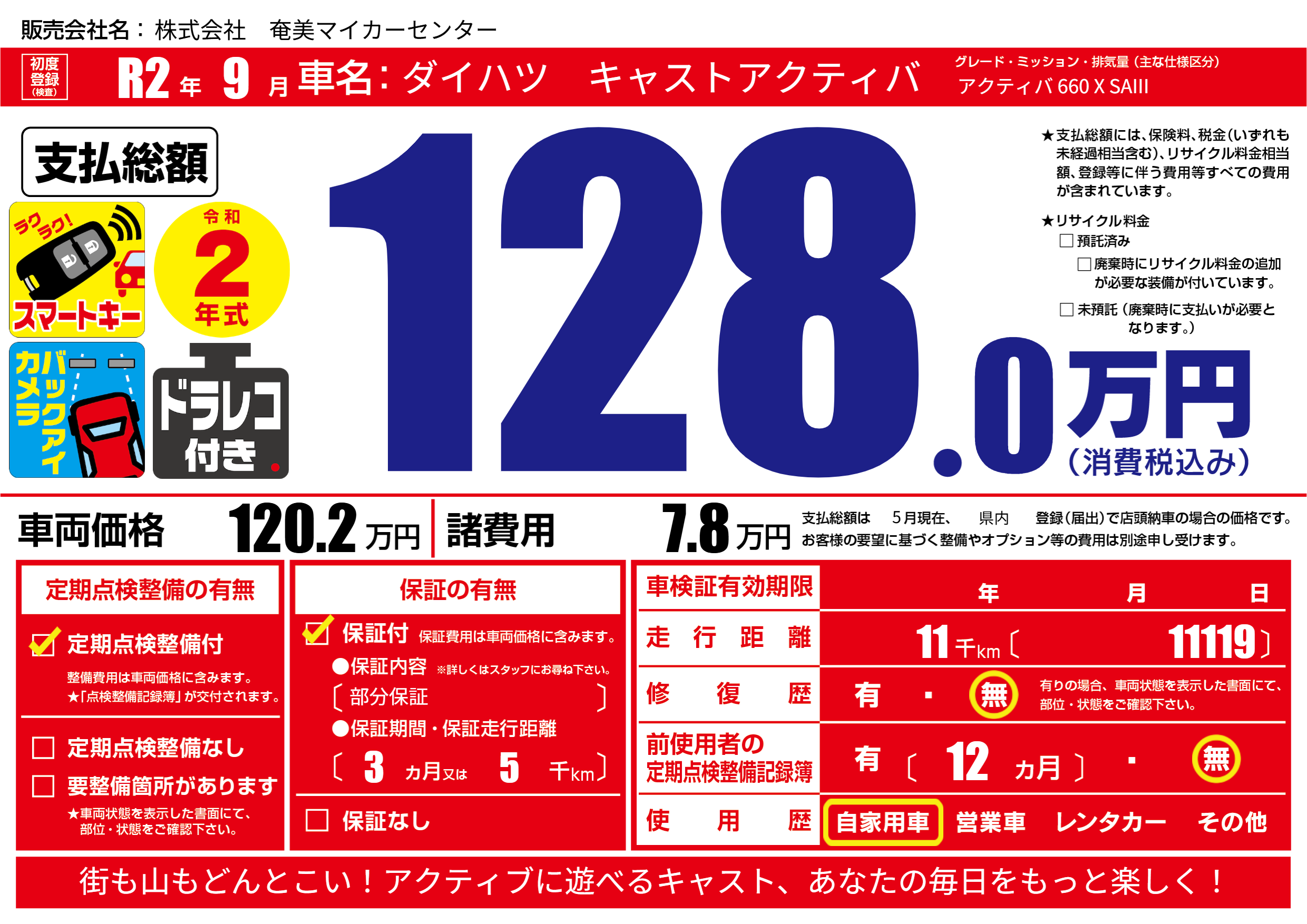 | 走行キロ | 1.1万km | 初年度登録 | R2年9月 |