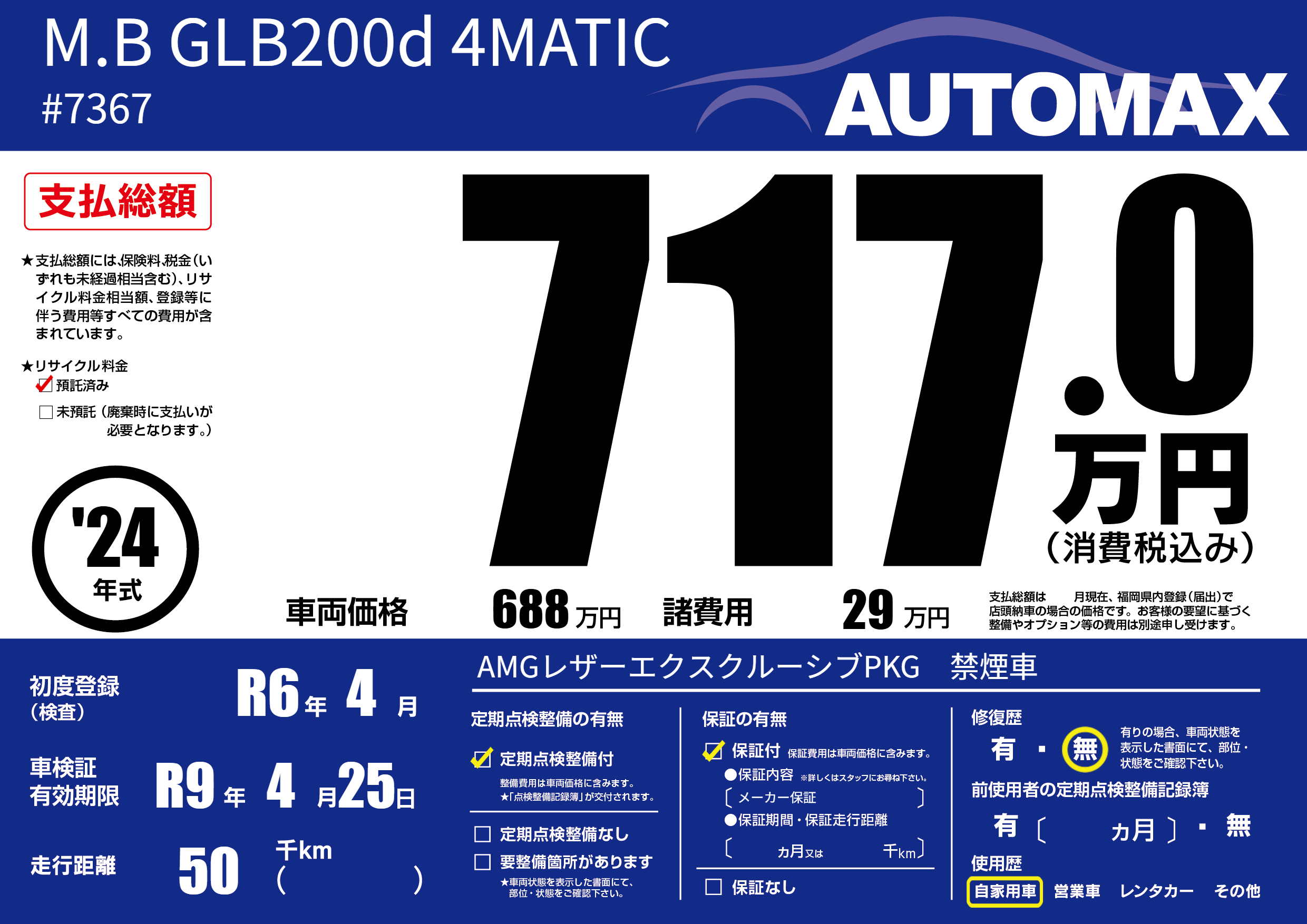 | 走行キロ | 5万km | 初年度登録 | R6年4月 |