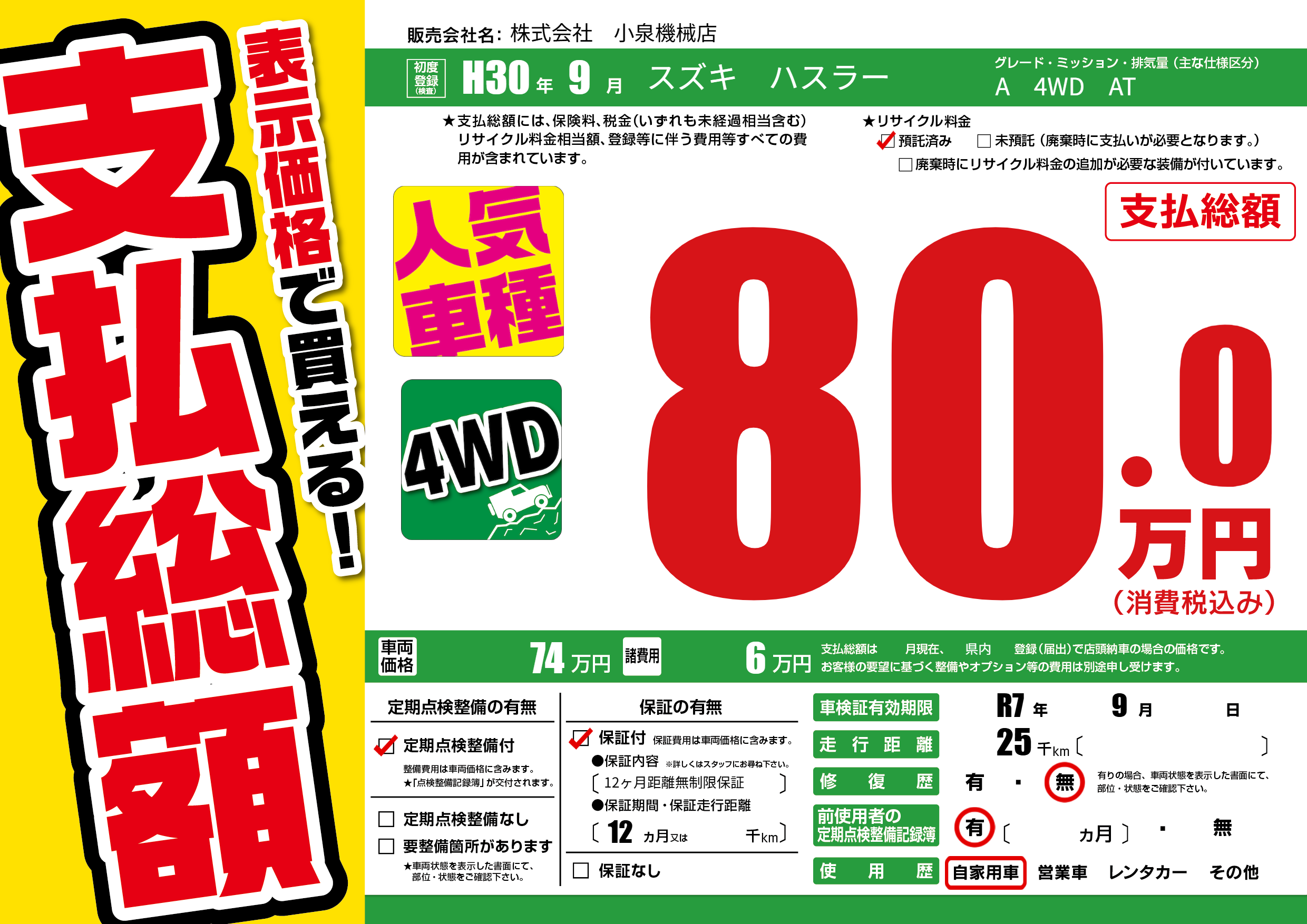 | 車名 | スズキ ハスラー | グレード ミッション 排気量 |
