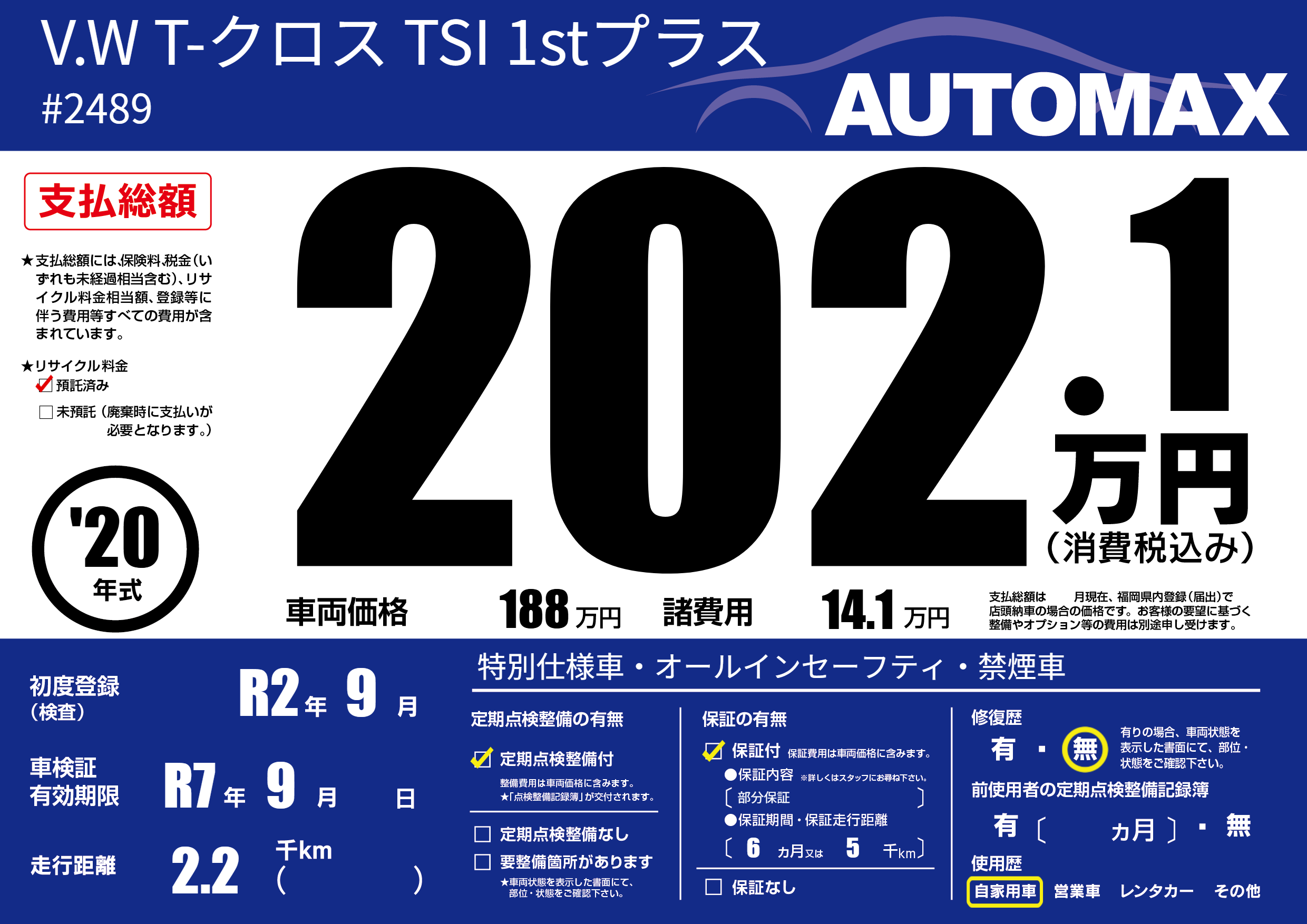 | 車名 | V.W T-クロス TSI 1stプラス | グレード ミッション 排気量 |