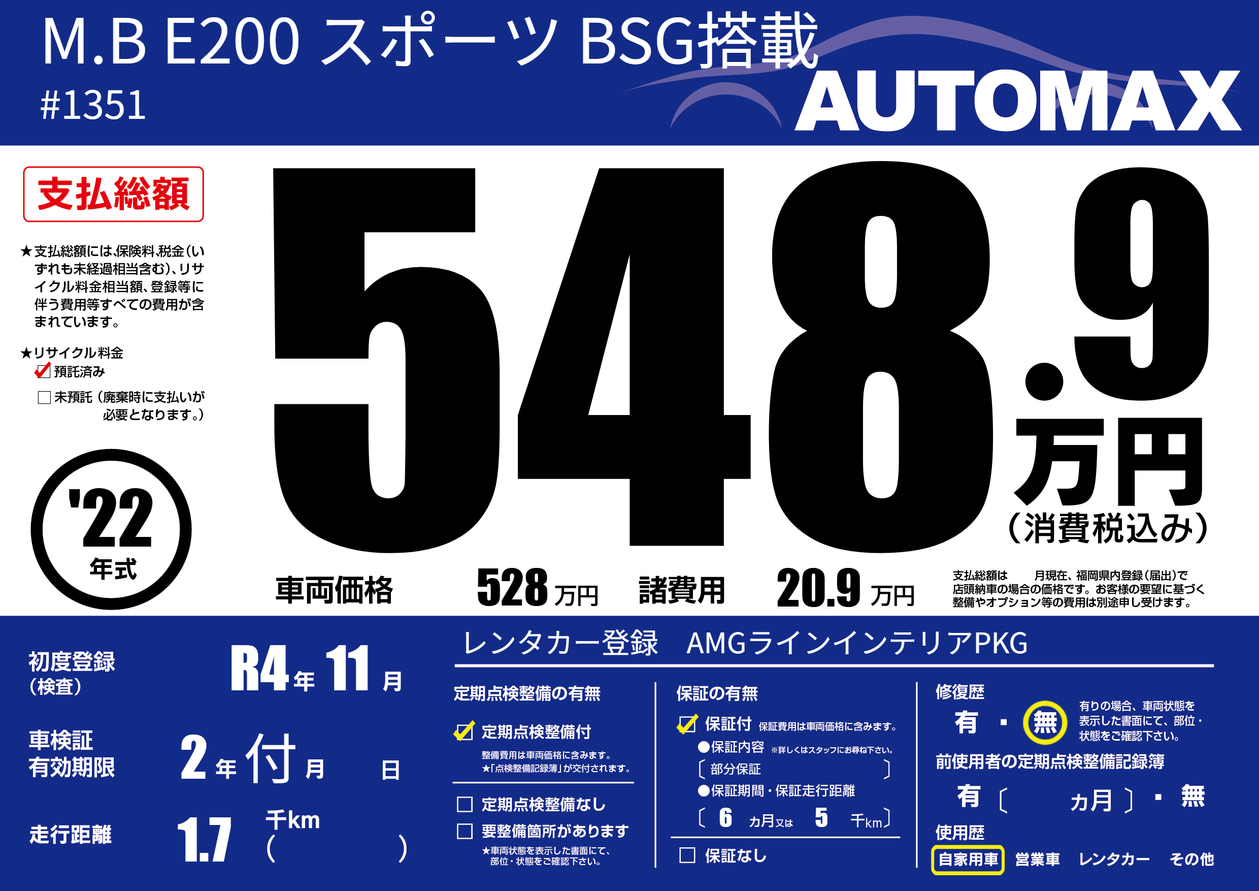 | 車名 | M.B E200 スポーツ BSG搭載 | グレード ミッション 排気量 |