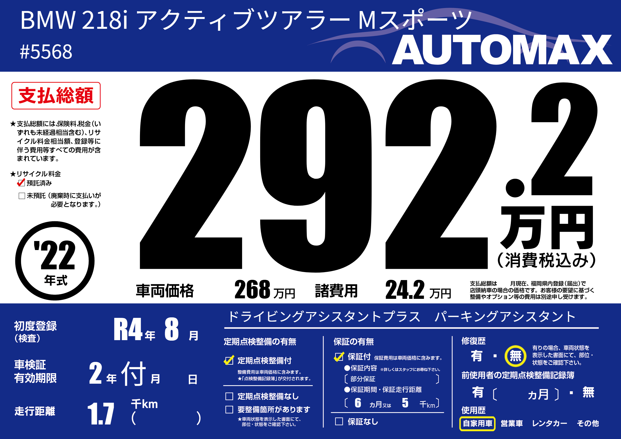 | 車名 | BMW 218i アクティブツアラー Mスポーツ | グレード ミッション 排気量 |