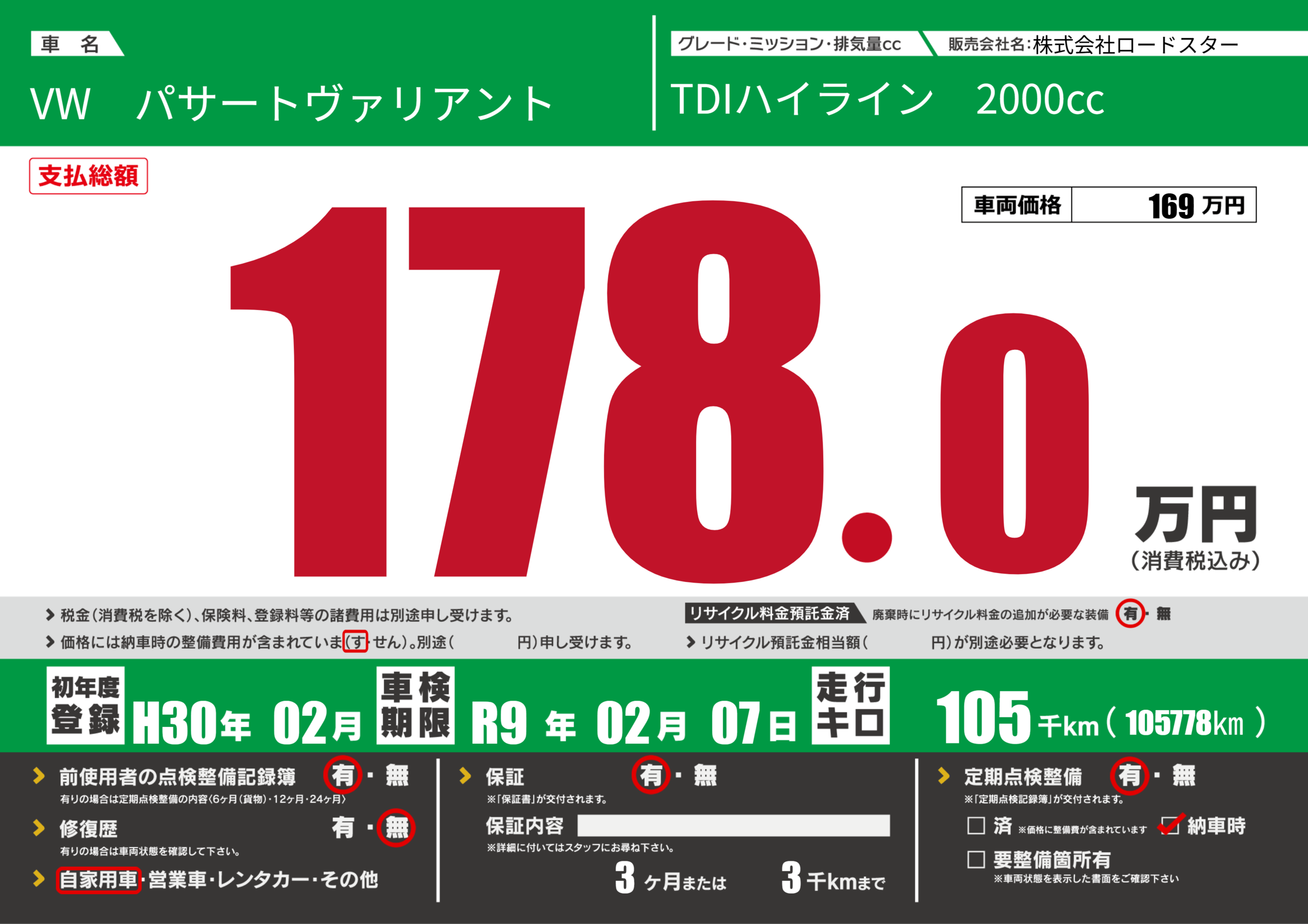 保証付き 保証内容(---) 3ヶ月または(3)千kmまで |