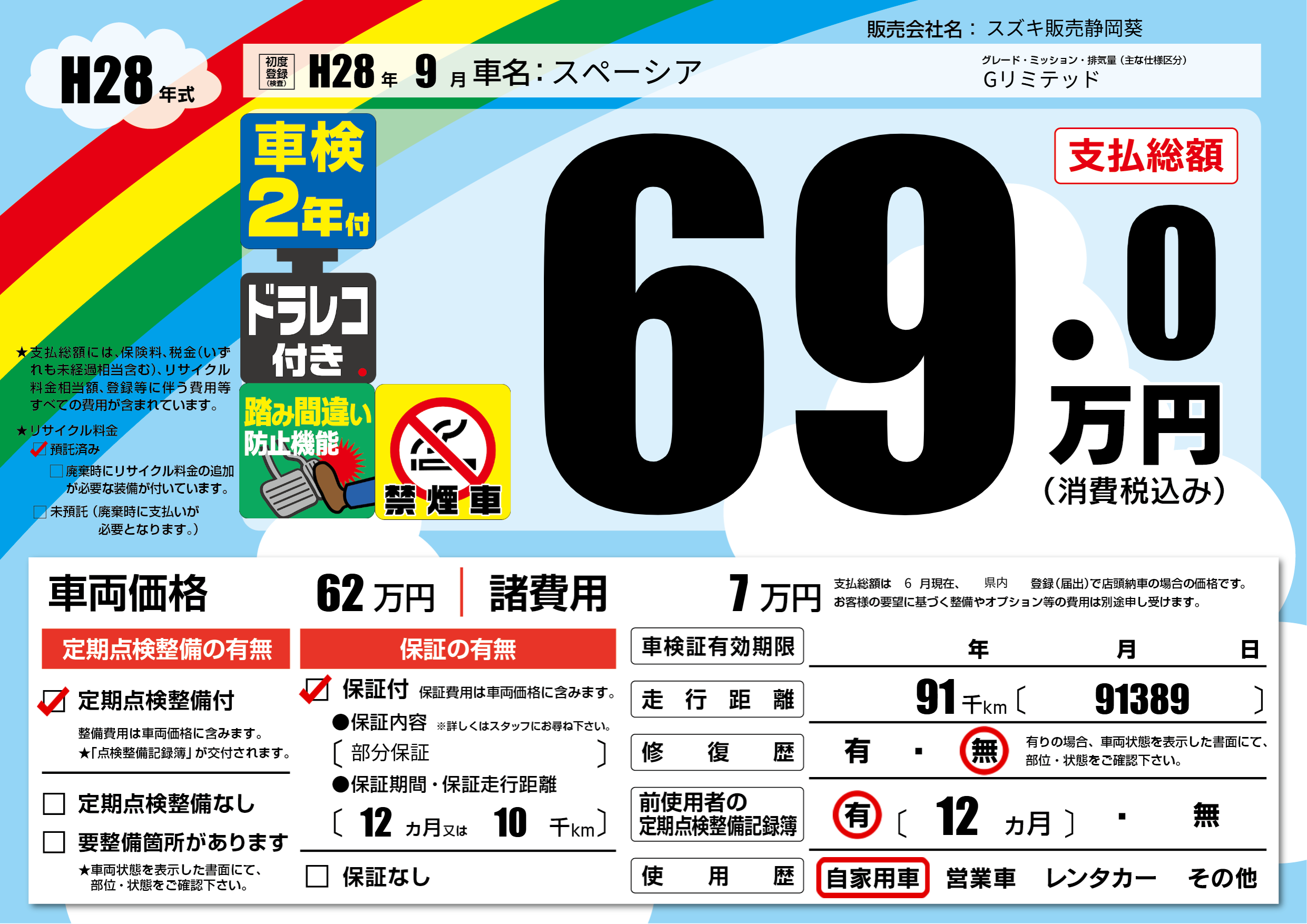 | 走行キロ | 9.1万km | 初年度登録 | H28年9月 |