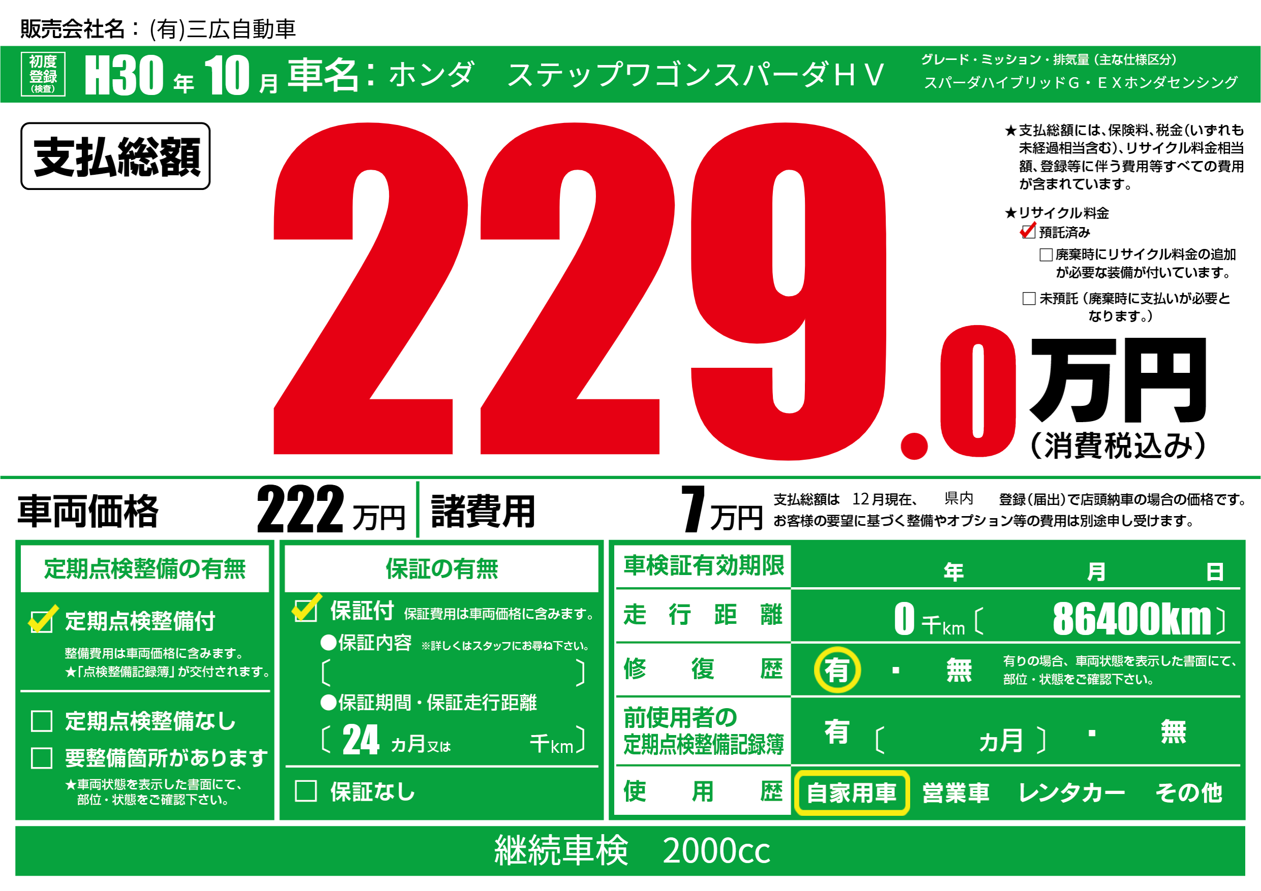 | 車検制限 | - 年 - 月 - 日 | ||