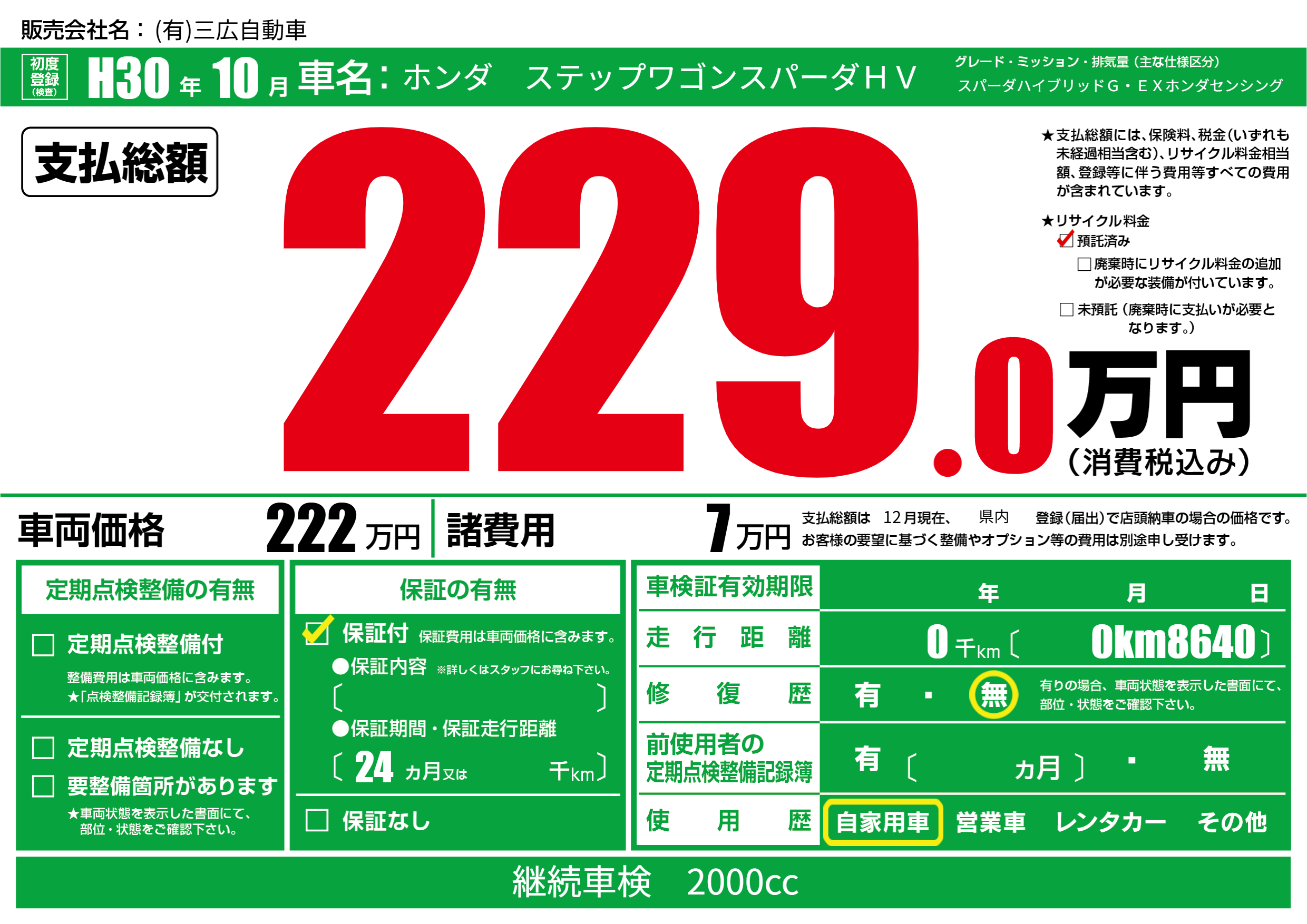 | 走行キロ | - | 初年度登録 | H30年10月 |