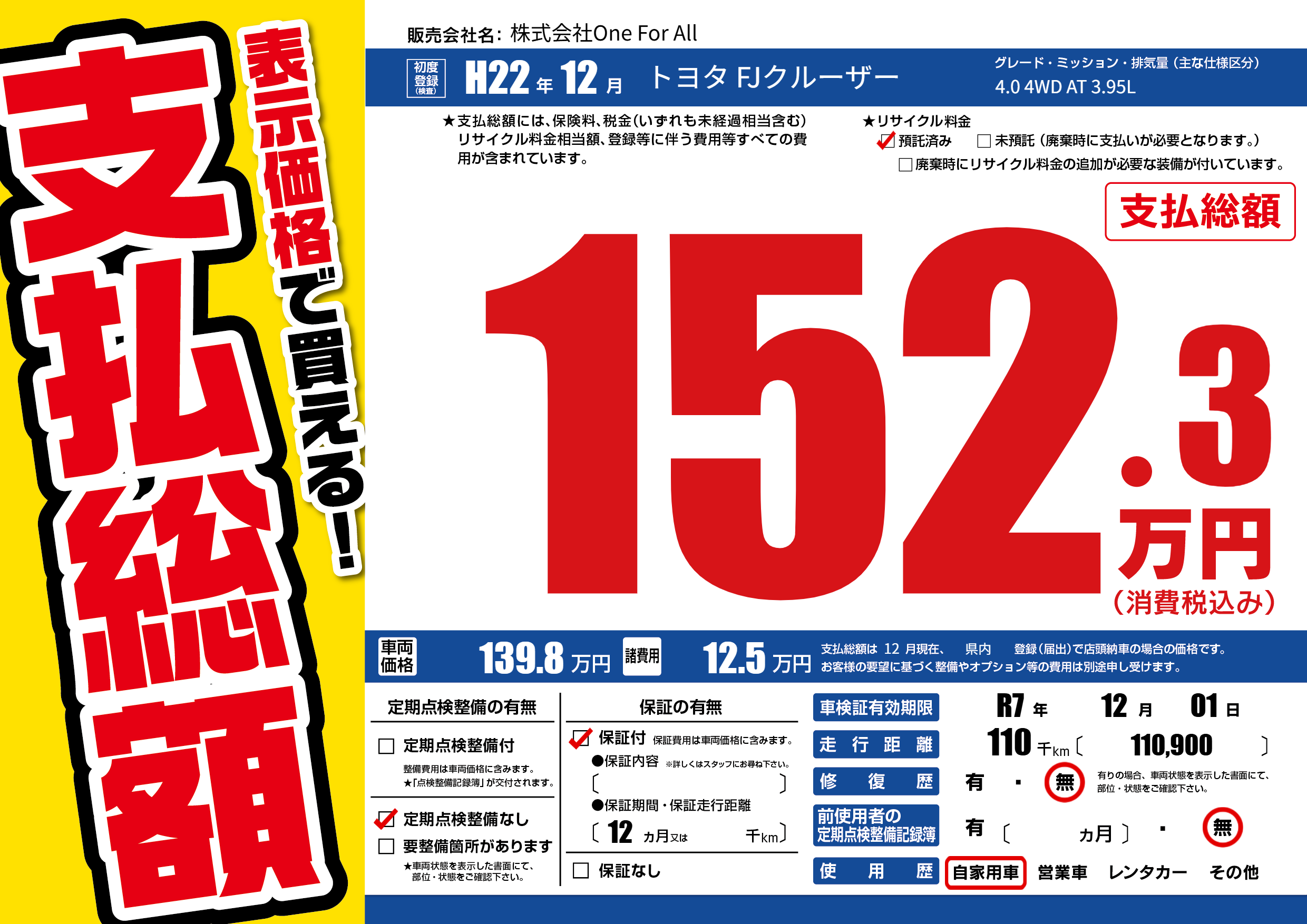 | 走行キロ | 11万km | 初年度登録 | H22年12月 |