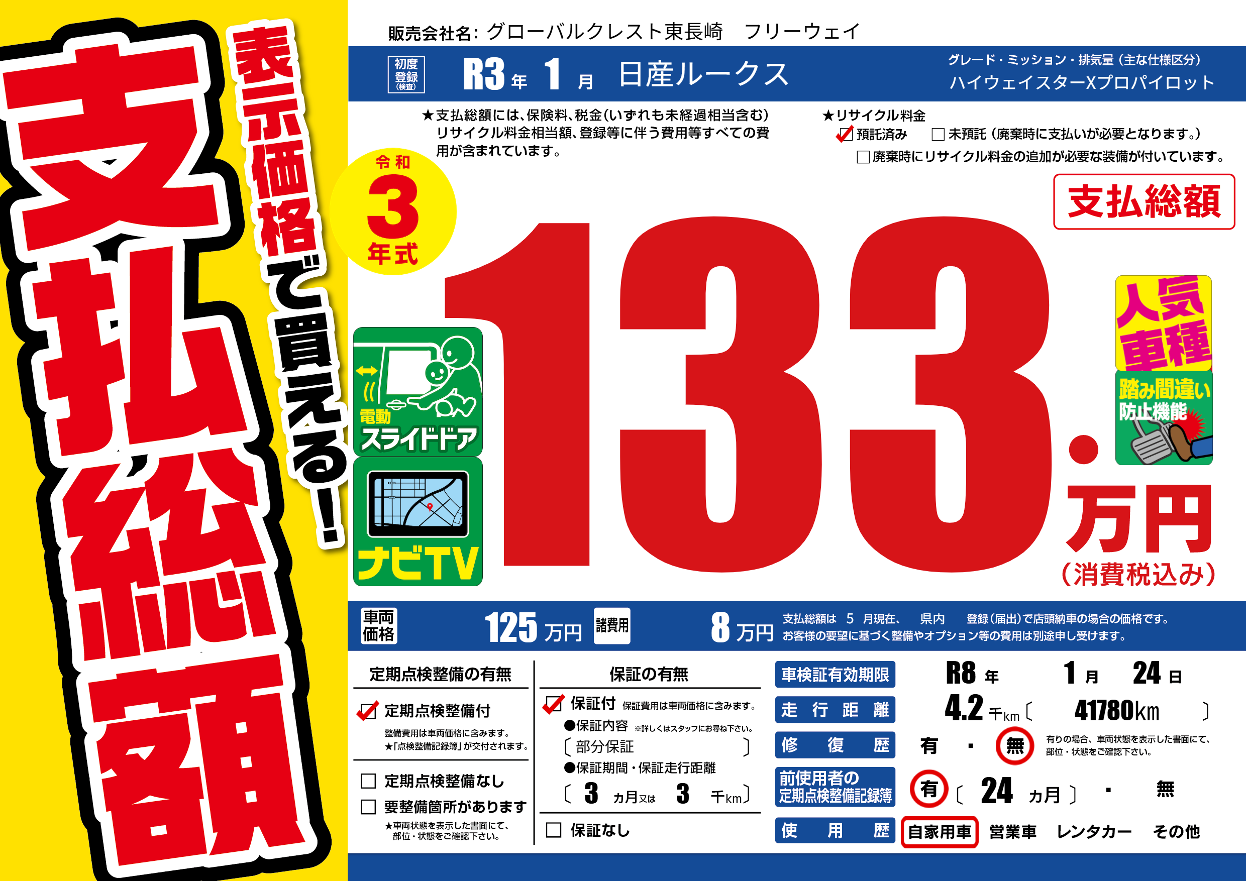 | 車名 | 日産ルークス | グレード ミッション 排気量 |