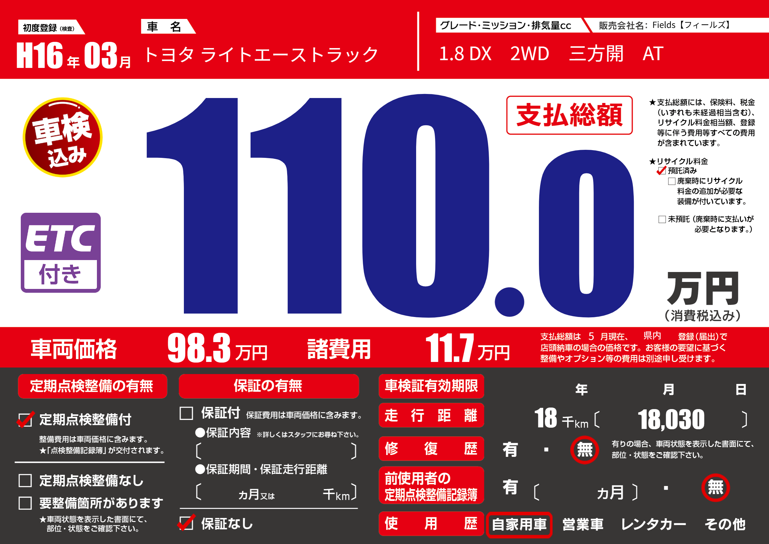 | 走行キロ | 1.8万km | 初年度登録 | H16年03月 |