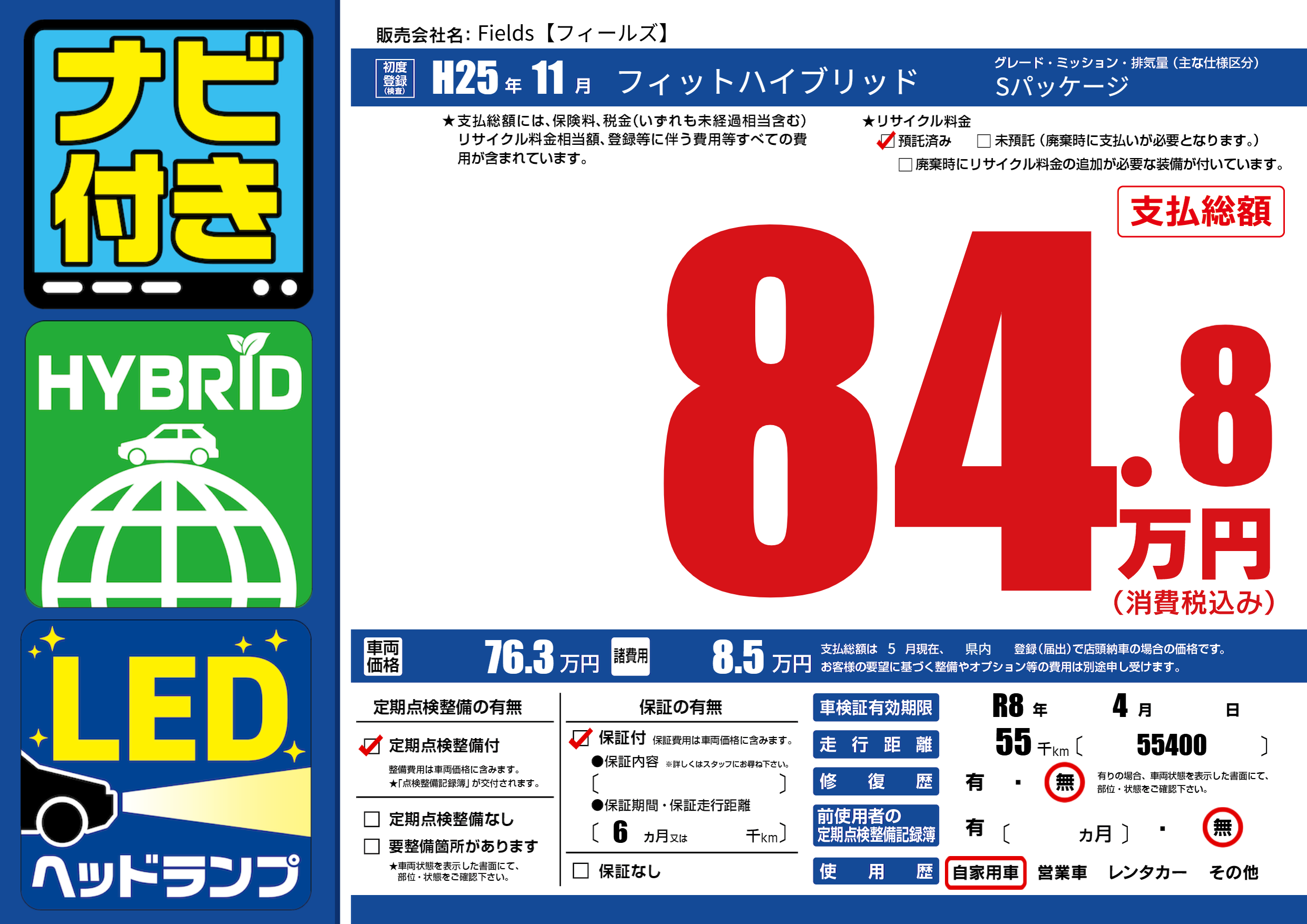 | 走行キロ | 5.5万km | 初年度登録 | H25年11月 |