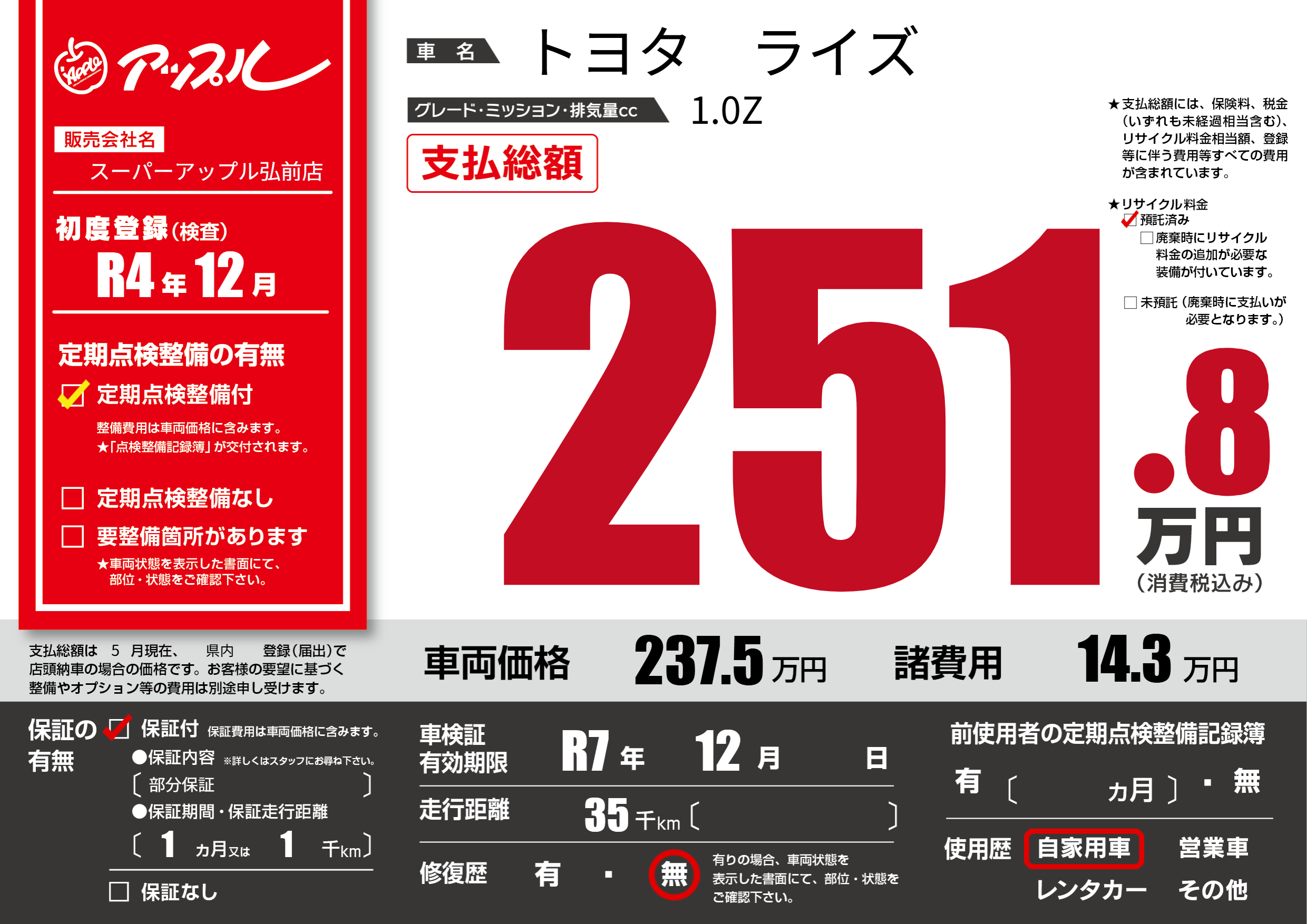 | 車名 | トヨタ ライズ | グレード ミッション 排気量 |