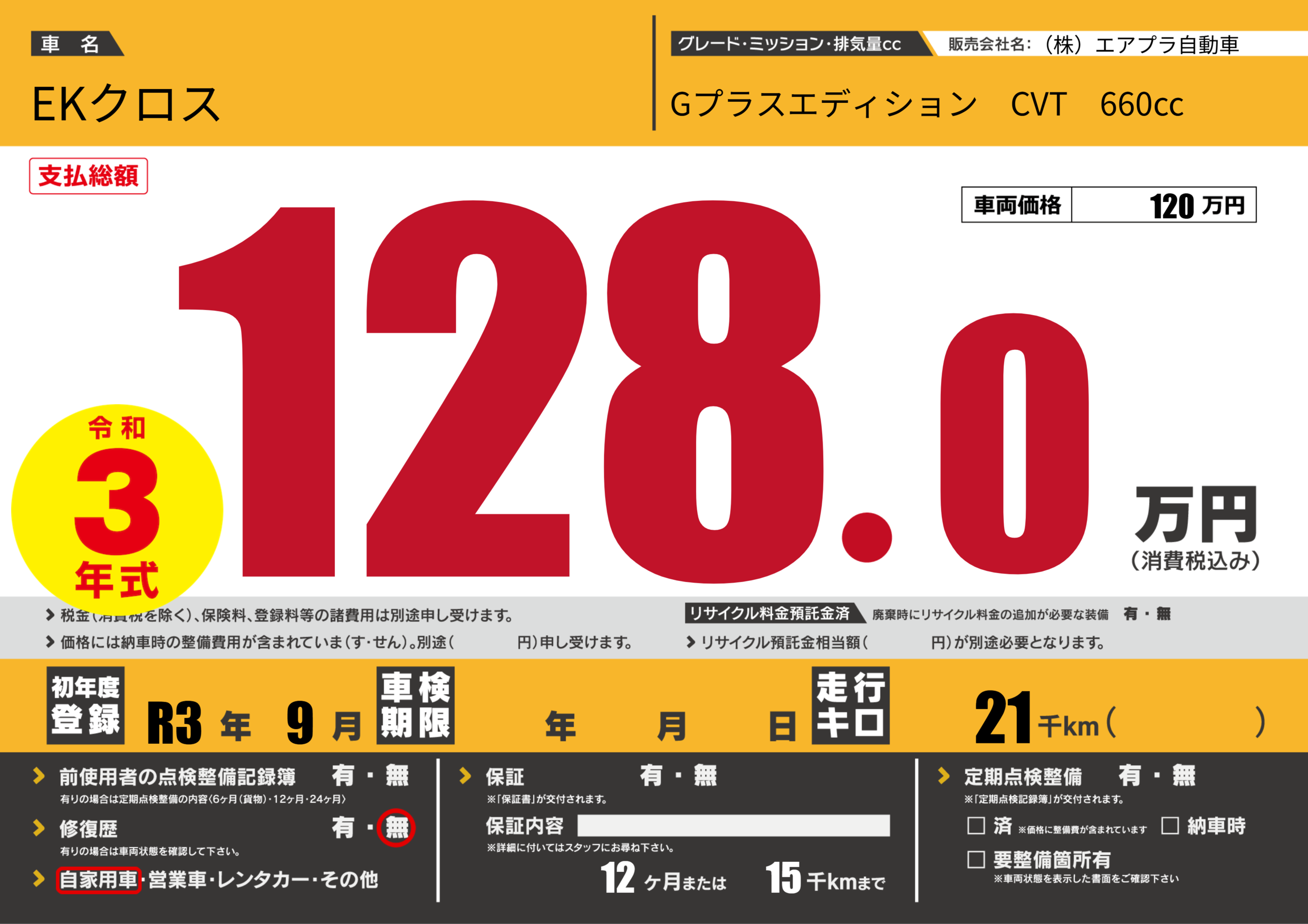 | 初年度登録 | R3年9月 | ||