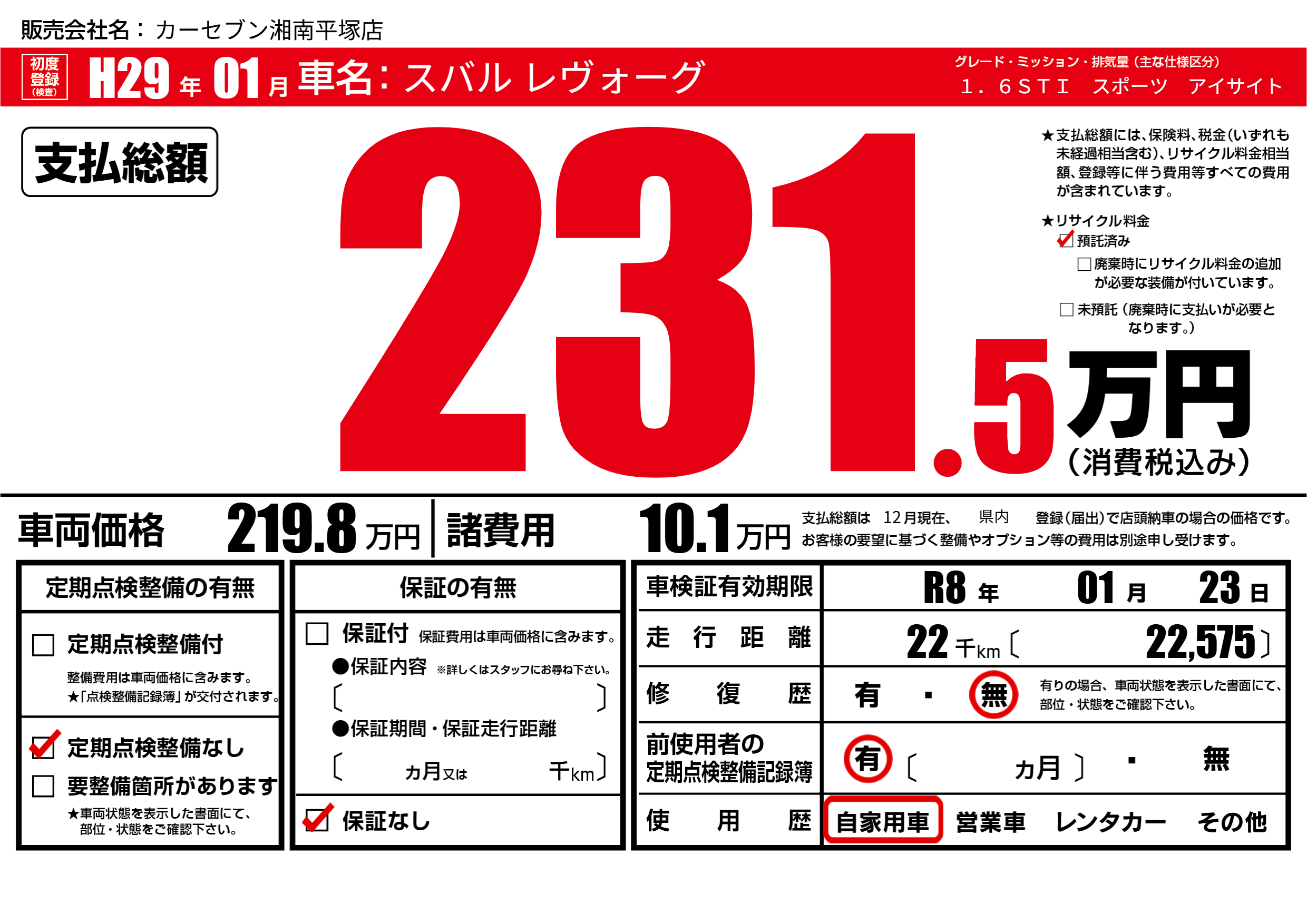 | 車名 | スバル レヴォーグ | グレード ミッション 排気量 |