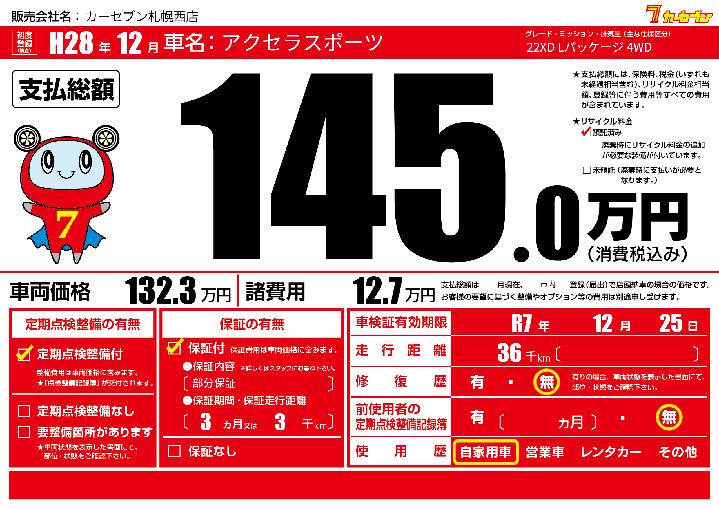 | 走行キロ | 3.6万km | 初年度登録 | H28年12月 |