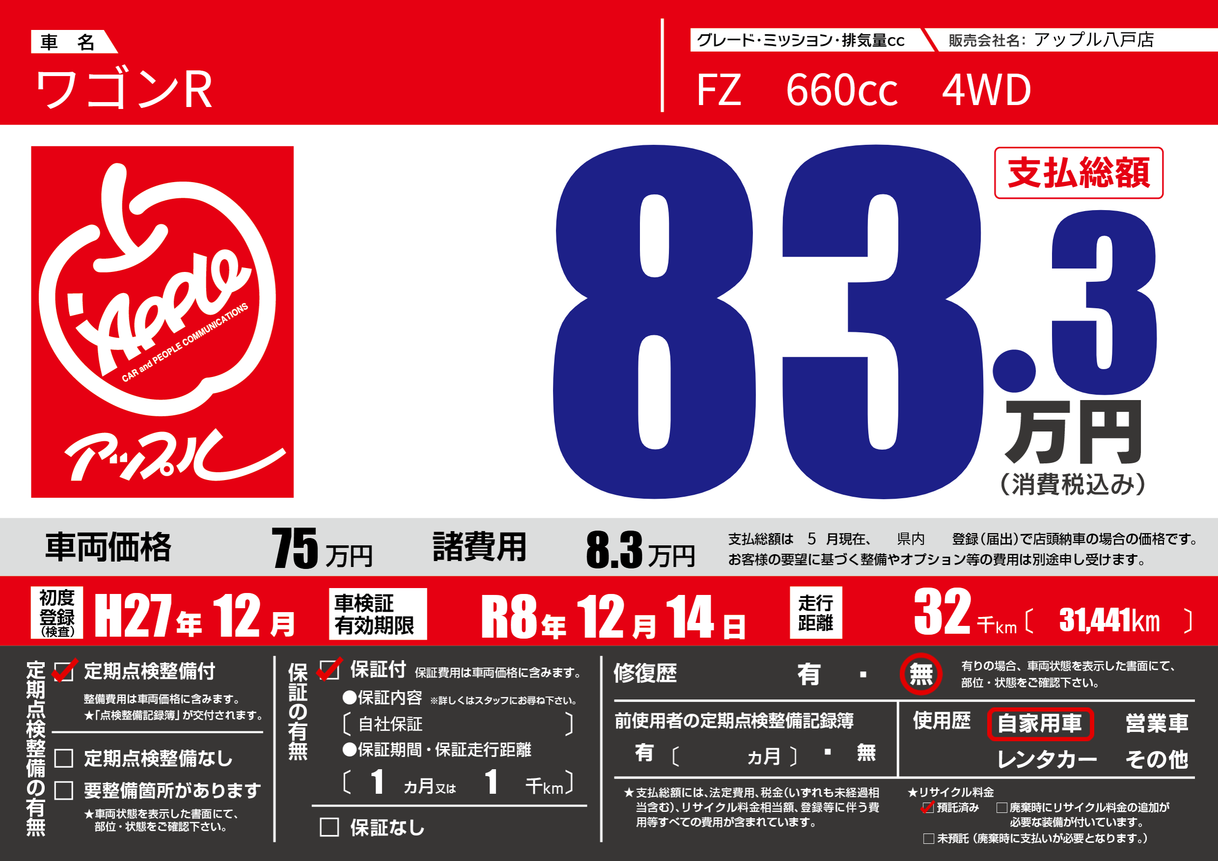 | 車名 | ワゴンR | グレード ミッション 排気量 |