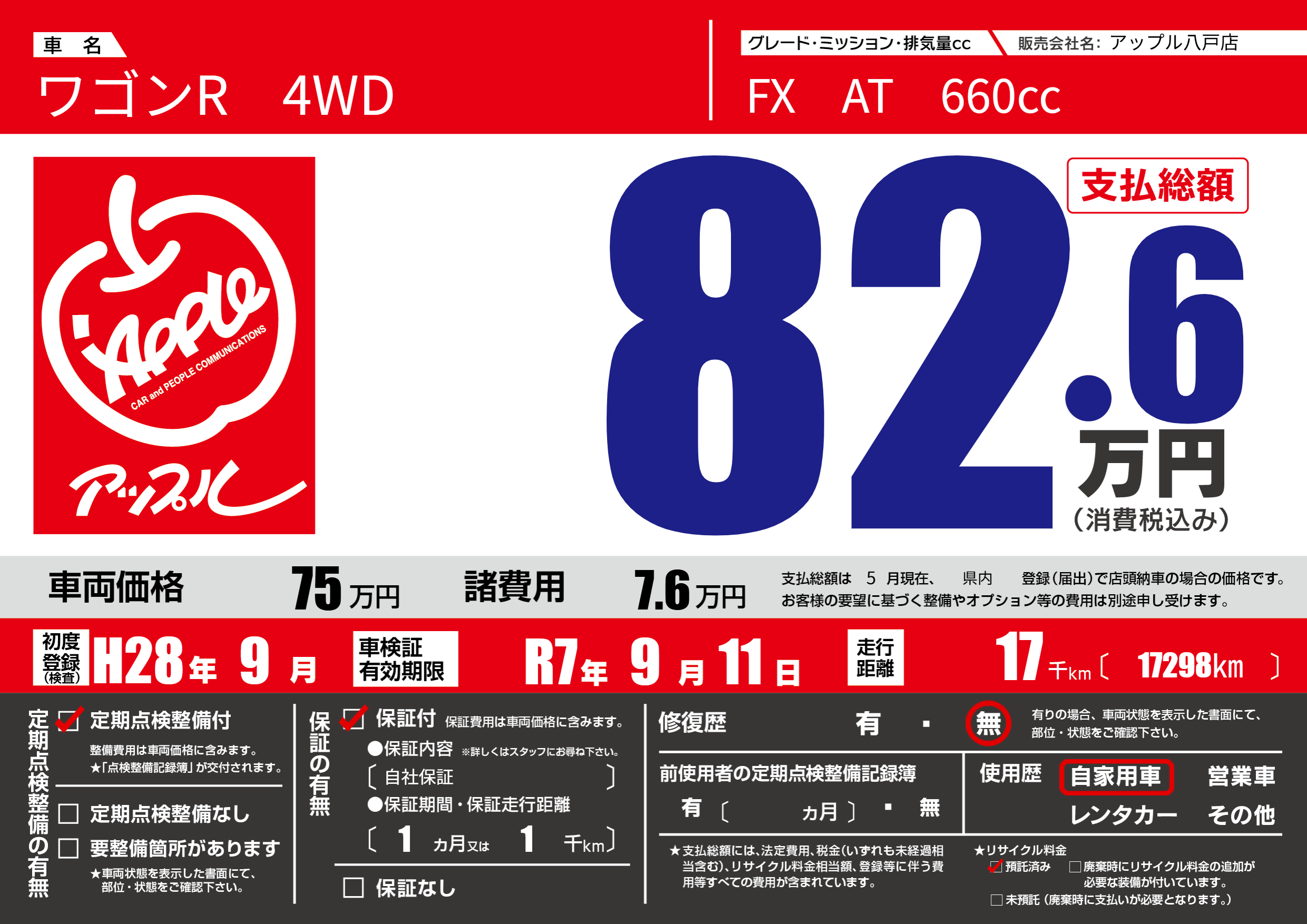 | 車名 | ワゴンR 4WD | グレード ミッション 排気量 |