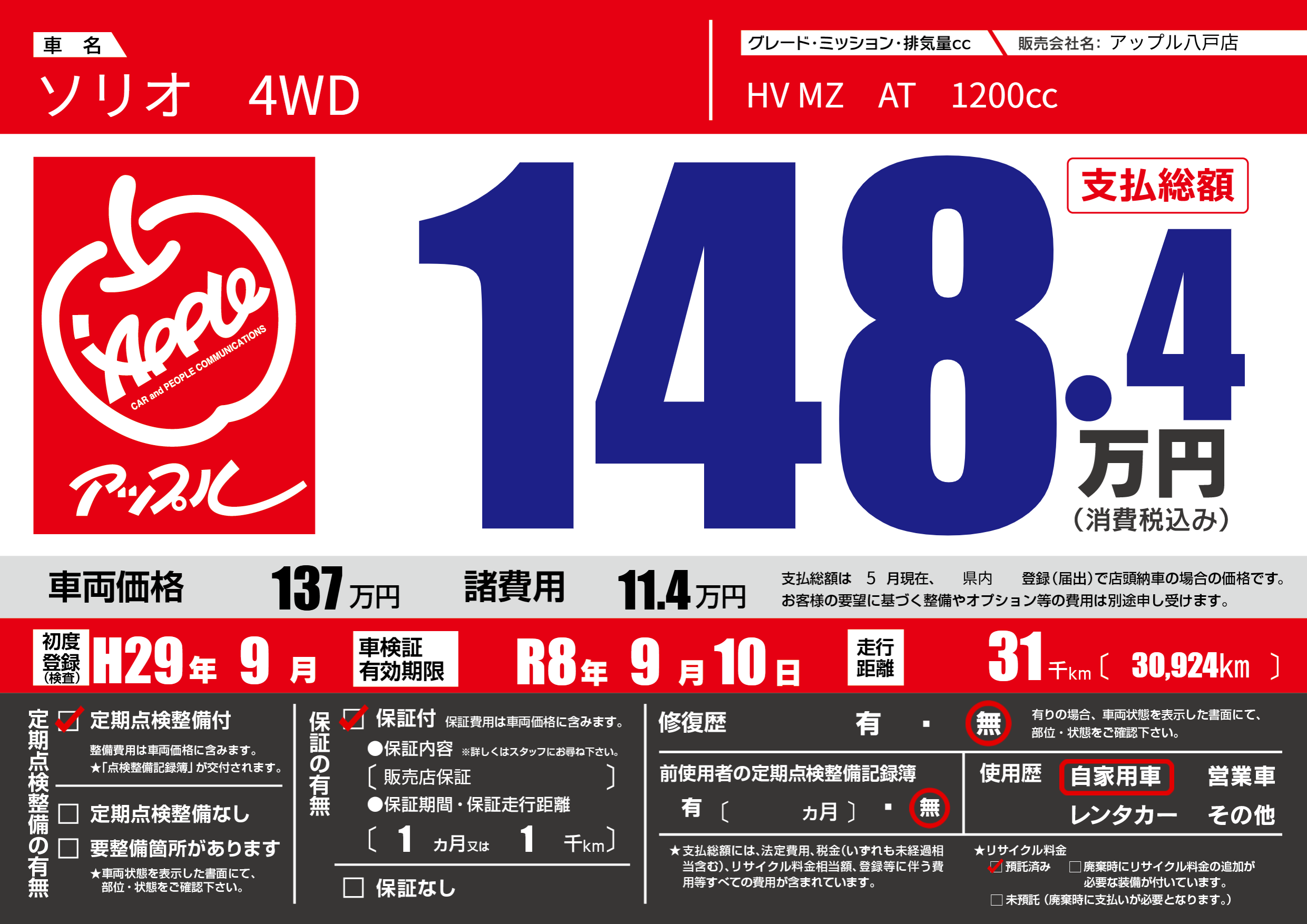| 走行キロ | 3.1万km | 初年度登録 | H29年9月 |
