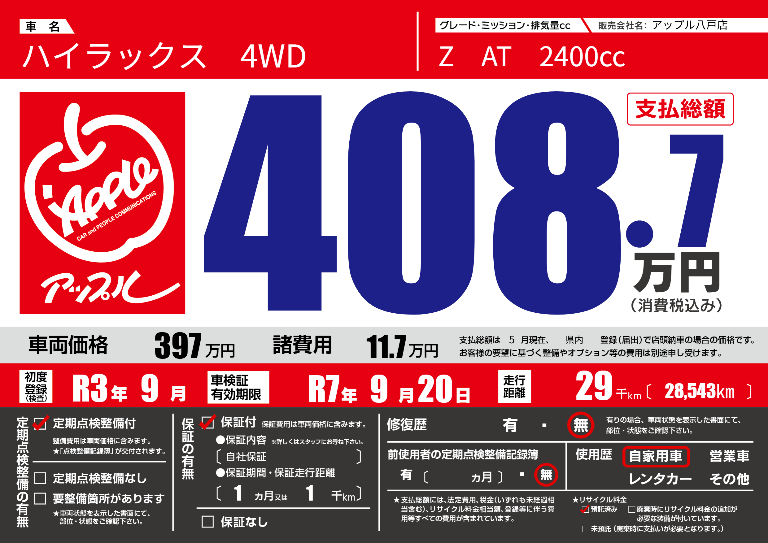 | 車名 | ハイラックス 4WD | グレード ミッション 排気量 |