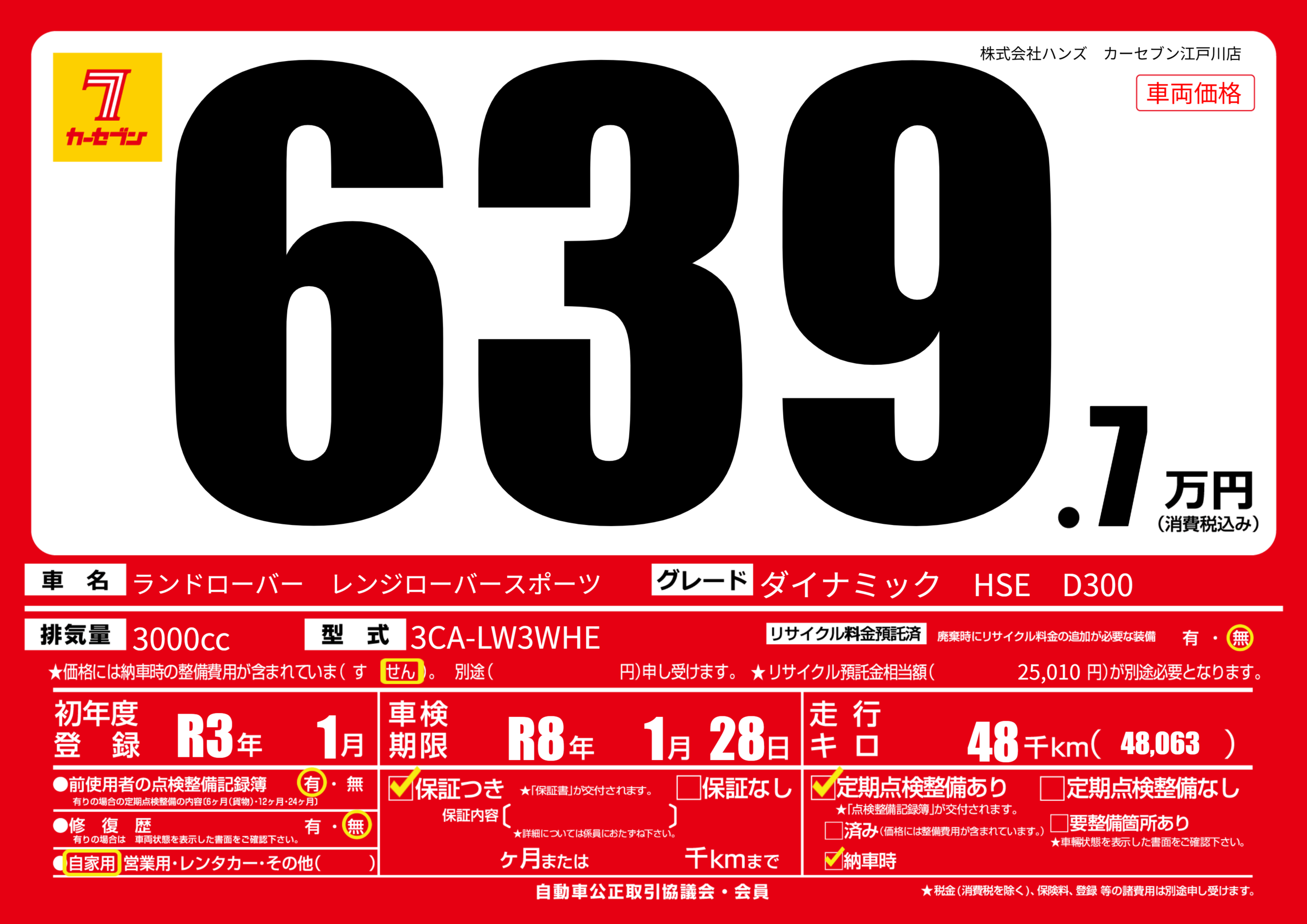 | 車名 | ランドローバー レンジローバースポーツ | グレード ミッション 排気量 |