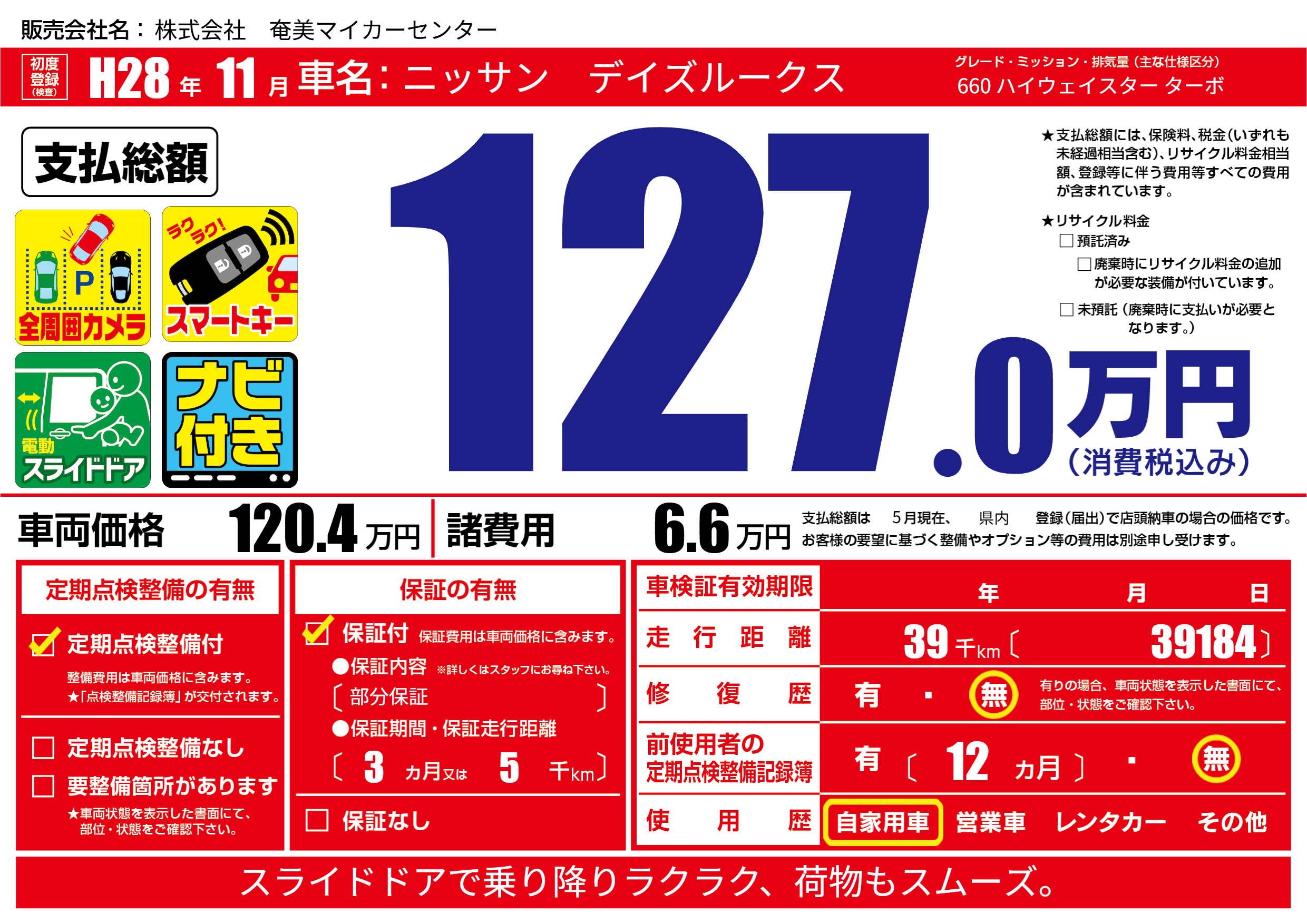 | 走行キロ | 3.9万km | 初年度登録 | H28年11月 |